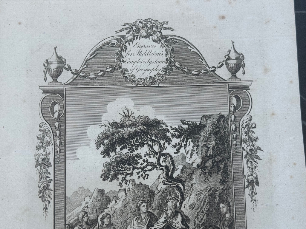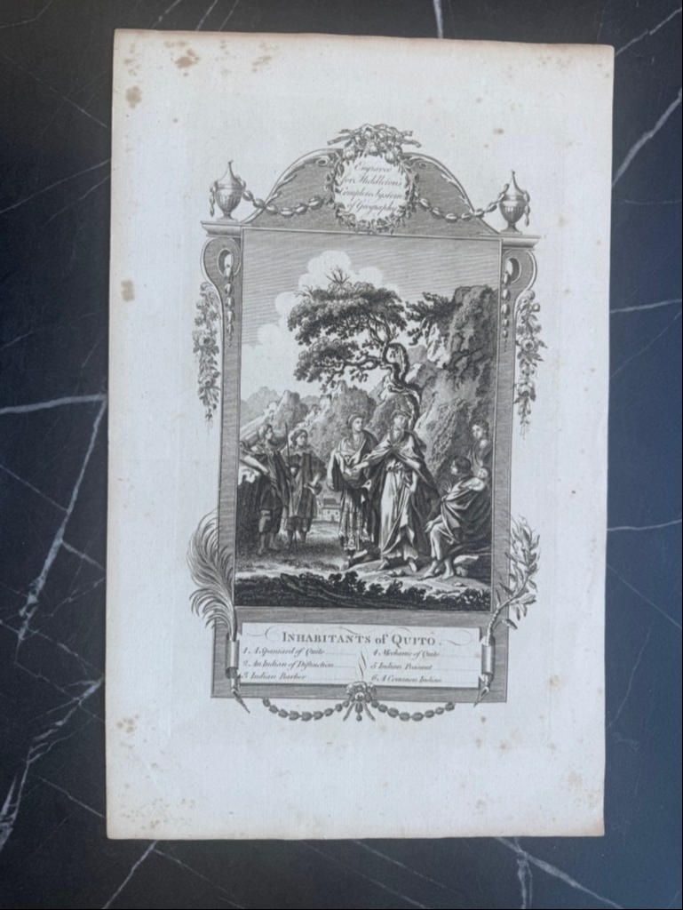 Habitantes de Quito, Sudamérica, de la Geografía de Middleton, 1777. Este grabado temprano, titulado "Habitantes de Quito", fue realizado para "Un Sistema Completo de Geografía" de Charles Theodore Middleton (Londres, 1777). Es un grabado en cobre de gran detalle, enmarcado en una elaborada cartela decorativa, que ilustra la fascinación del siglo XVIII por la representación etnográfica y la estética neoclásica. La estampa muestra seis figuras, cada una cuidadosamente identificada en el epígrafe inferior: 1. Un español de Quito; 2. Un indígena notable; 3. Un barbero indígena; 4. Un mecánico quiteño; 5. Un campesino indígena; 6. Un indígena común. Con un paisaje montañoso que evoca el altiplano andino como fondo, las figuras visten diversos trajes regionales. El español aparece con elegantes ropajes europeos, que reflejan la autoridad colonial y su posición social, mientras que las figuras indígenas se representan con una variedad de atuendos tradicionales y de clase trabajadora. El indígena distinguido viste ropas más elaboradas, quizás en alusión a su herencia inca o noble, mientras que el plebeyo y el campesino visten de forma más sencilla. La presencia de un barbero en el grupo sugiere la inclusión de diversos roles y profesiones sociales. Una mujer sentada con un niño refuerza los aspectos domésticos y familiares de la vida indígena. Este grabado pertenece a una larga tradición de publicaciones europeas que intentaron documentar la diversidad de culturas humanas en todo el mundo, a menudo desde una perspectiva eurocéntrica. Como tal, ofrece una visión fascinante, aunque estilizada, de cómo los habitantes de la Quito colonial (hoy capital de Ecuador) eran percibidos por el público europeo a finales del siglo XVIII. El grabado se titula dentro de un marco ornamentado de estilo rococó y lleva la nota "Grabado para el Sistema Completo de Geografía de Middleton". Estos volúmenes circularon ampliamente durante la Ilustración y su objetivo era educar a los lectores británicos sobre las culturas del mundo, la geografía y la expansión colonial. Informe de estado: De regular a bueno para su antigüedad. Ligera tonalidad y ligero desgaste en los bordes, propios de su antigüedad. La impresión de la plancha se mantiene firme. Márgenes amplios. Presenta algunas ligeras arrugas, pero sin desgarros ni reparaciones. Consejos de enmarcado: Recomendamos un paspartú de calidad de museo en blanco roto o crema claro para resaltar las finas líneas del grabado, junto con un marco neoclásico o dorado antiguo para complementar la cartela decorativa. Se recomienda usar cristal con protección UV para preservar la calidad y el detalle del papel. Esta pieza es ideal para un escritorio.una pared de biblioteca o galería donde se exhiben grabados históricos y etnográficos.