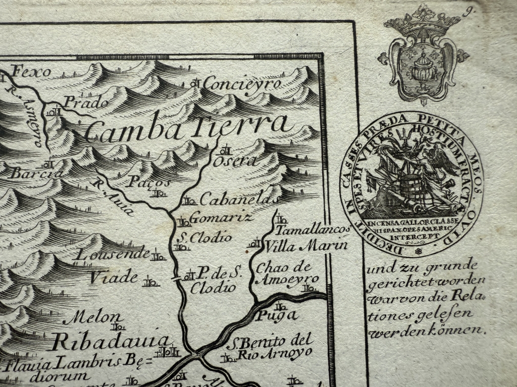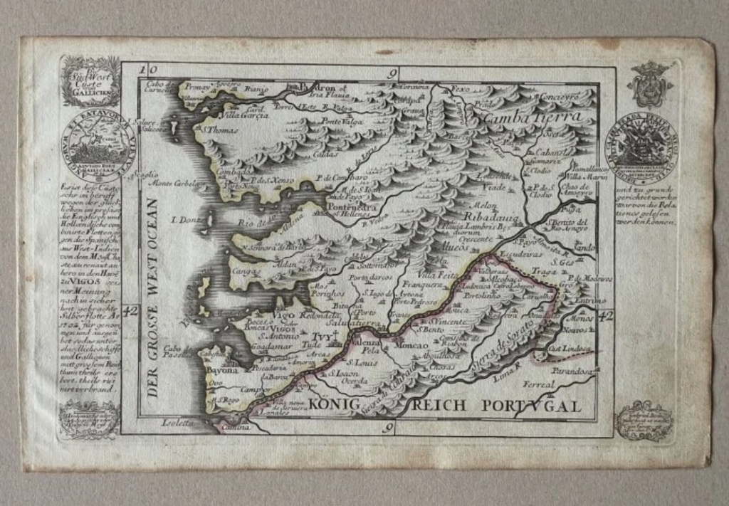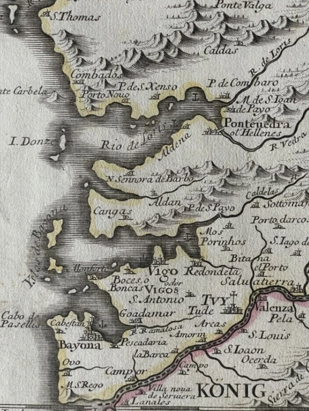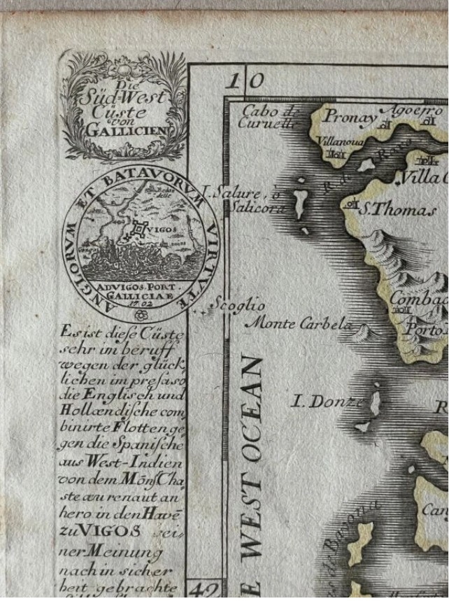 vegetariano. En el ángulo superior del Escudo de Galicia. En la dirección angular superior: “9”, que corresponde a este número en el atlas. En el ángulo superior pude insertar un medallón con una vista de la Ría de Vigo y la Batalla Naval de Rande (ataque de las flotas inglés y holandés en español, que está registrado en América), con el epígrafe: "Anglorvm et batavorvm virtvte. Ad Vigos Port. Galliciae.