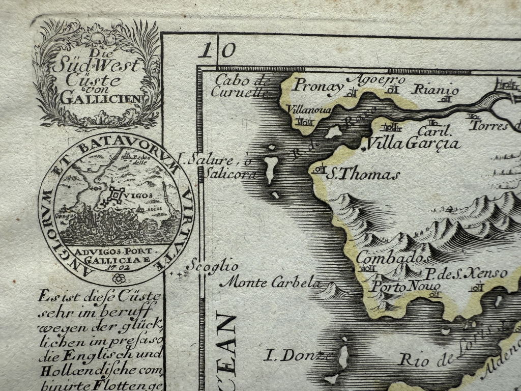 La cartografía, conmemorativa de la famosa batalla naval de Rande, muestra de manera muy detallada la parte suroeste de Galicia, Pontevedra (España) así como sus áreas adyacentes, donde podemos encontrar numerosos detalles, topográficos y geográficos, como ciudades, islas, ríos montañas... A ambos lados se encuentra adornado con unos dibujos, unas cartelas y con textos en alemán relativos al grabado.
