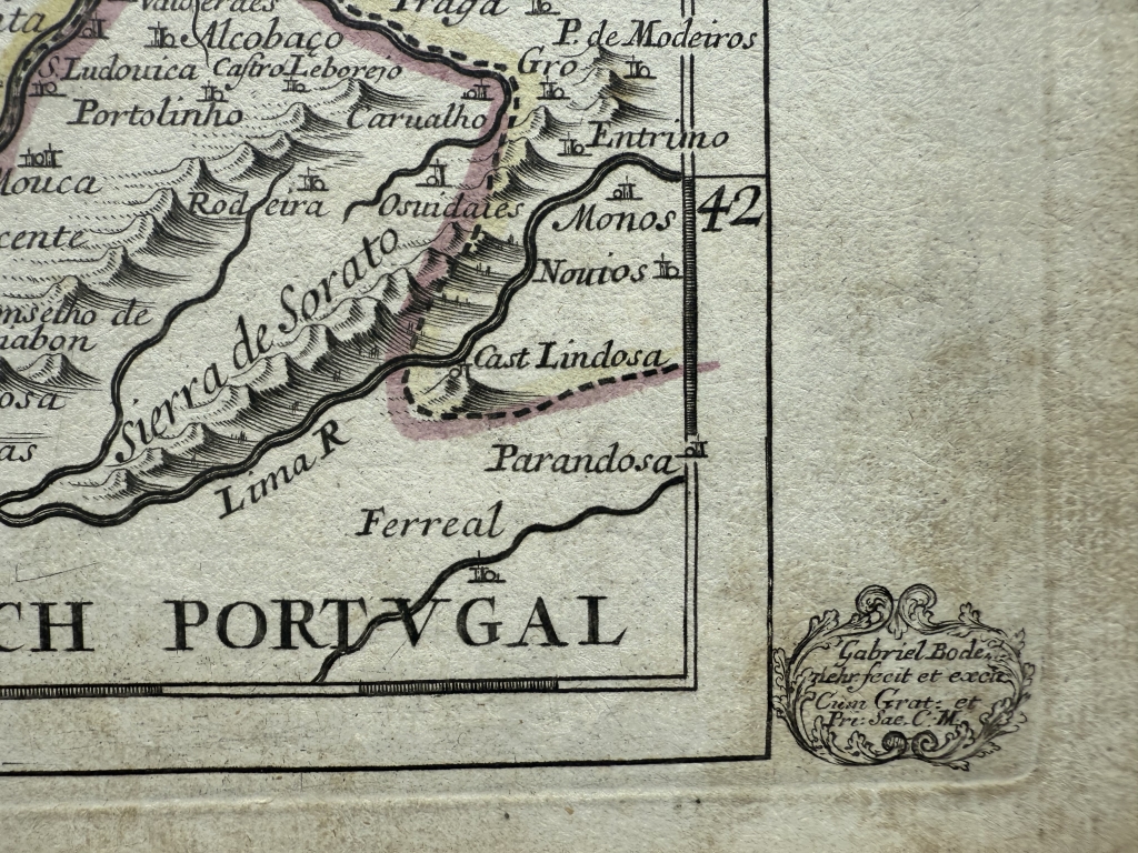 Gabriel Bodenehr compiló los mapas de Johann Stridbeck en 1716 y publicó algunos mapas adjudicándose la autoría y el grabado, y borrando tu nombre, como este de Galicia, según se lee en la parte inferior derecha. Johann Stridbeck publicó por primera vez Atlas Curieux en 1677 La edición del mapa de Galicia de Bodenehr es originaria de Stridbeck.