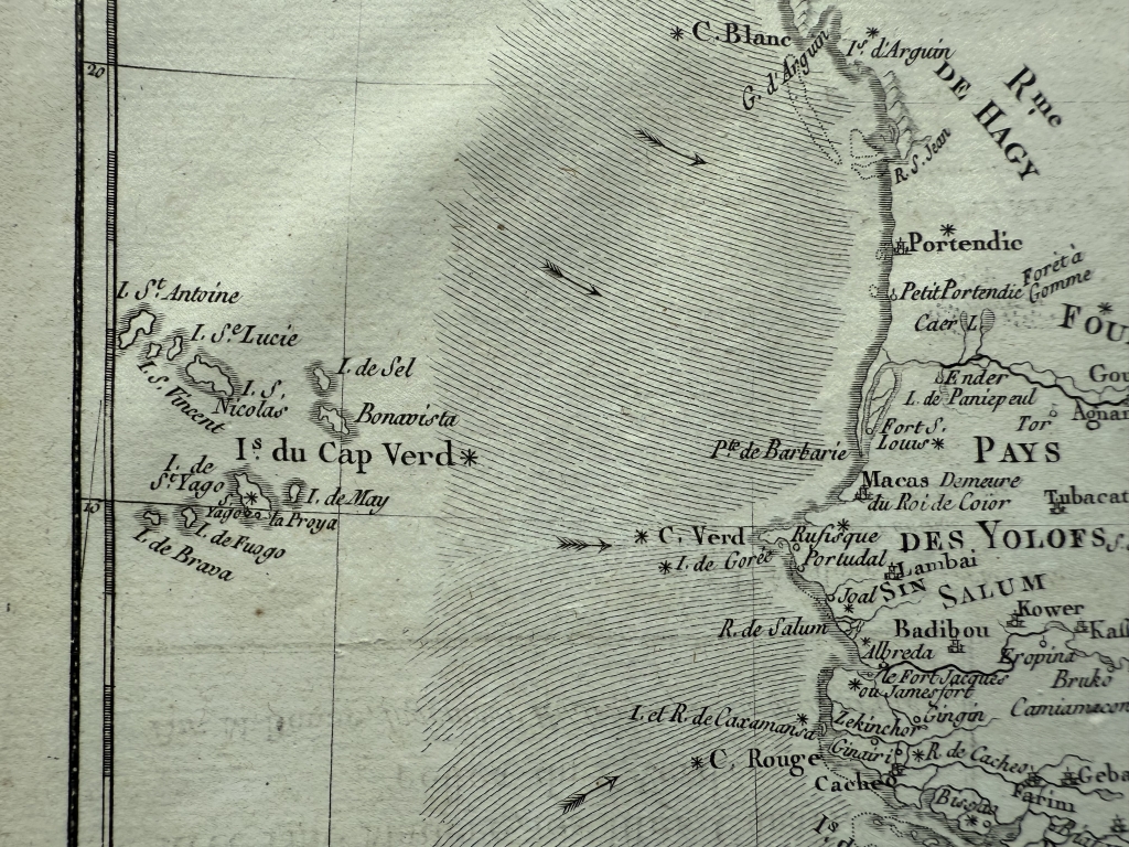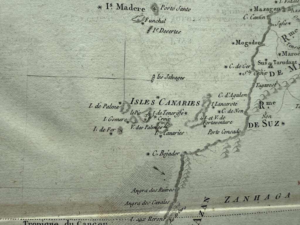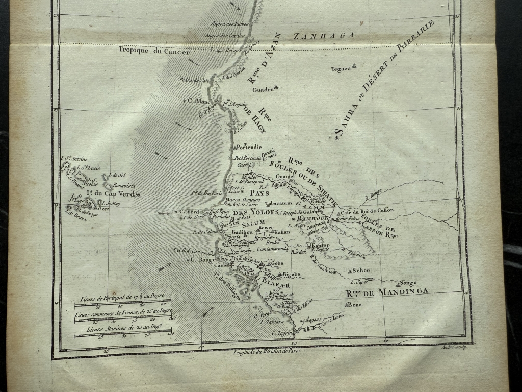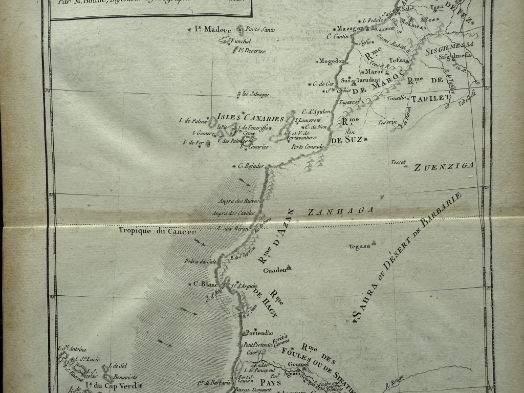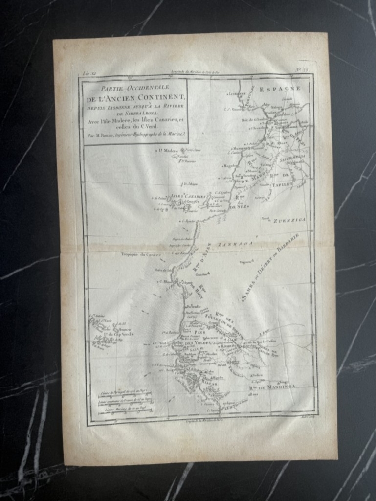 Descripción: Impresionante y detallado mapa de África Occidental de 1780, grabado en cobre por Rigobert Bonne y Guillaume Raynal. Esta área corresponde a los actuales Marruecos, Sáhara Occidental, Mauritania y Argelia. Incluye las Islas Canarias, Madeira y Cabo Verde. Ofrece un escaso detalle del interior, reflejo del escaso conocimiento que existía sobre el continente en aquella época. La excepción son los valles de los ríos Senegal y Gambia, que se extienden tierra adentro desde Cabo Verde y que en aquel entonces estaban siendo cartografiados por exploradores y misioneros. Flechas y líneas de sombreado muestran algunas de las corrientes oceánicas y vientos que dificultaban la navegación en esta región durante los inicios de la exploración africana. En su margen superior-izquierdo posee una sencilla cartela de título y al lado opuesto, las escalas de medición utilizadas. Todo ello dentro de un recuadro graduado.