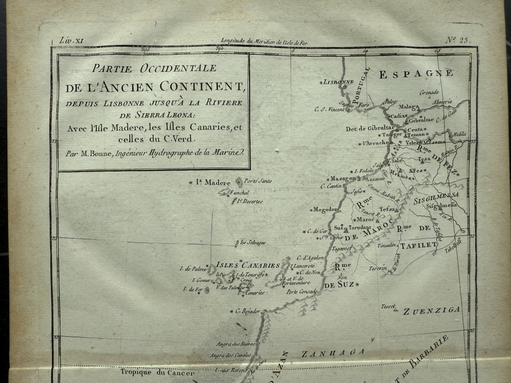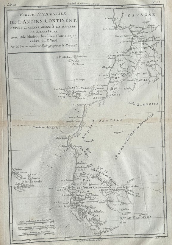 Título traducido: Parte occidental del Viejo Continente, desde Lisboa hasta el río Sierra Leona: incluyendo la isla de Madeira, las Islas Canarias y la de Cabo Verde. Por M. Bonne, Ingeniero Hidrográfico de la Armada.