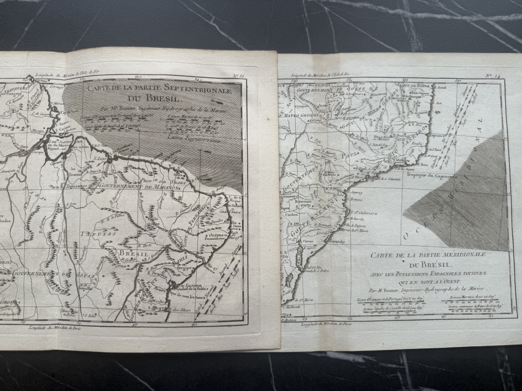 Dos mapas del norte y litoral de Brasil (América del sur), 1775 y 1780. Bonne/Raynal