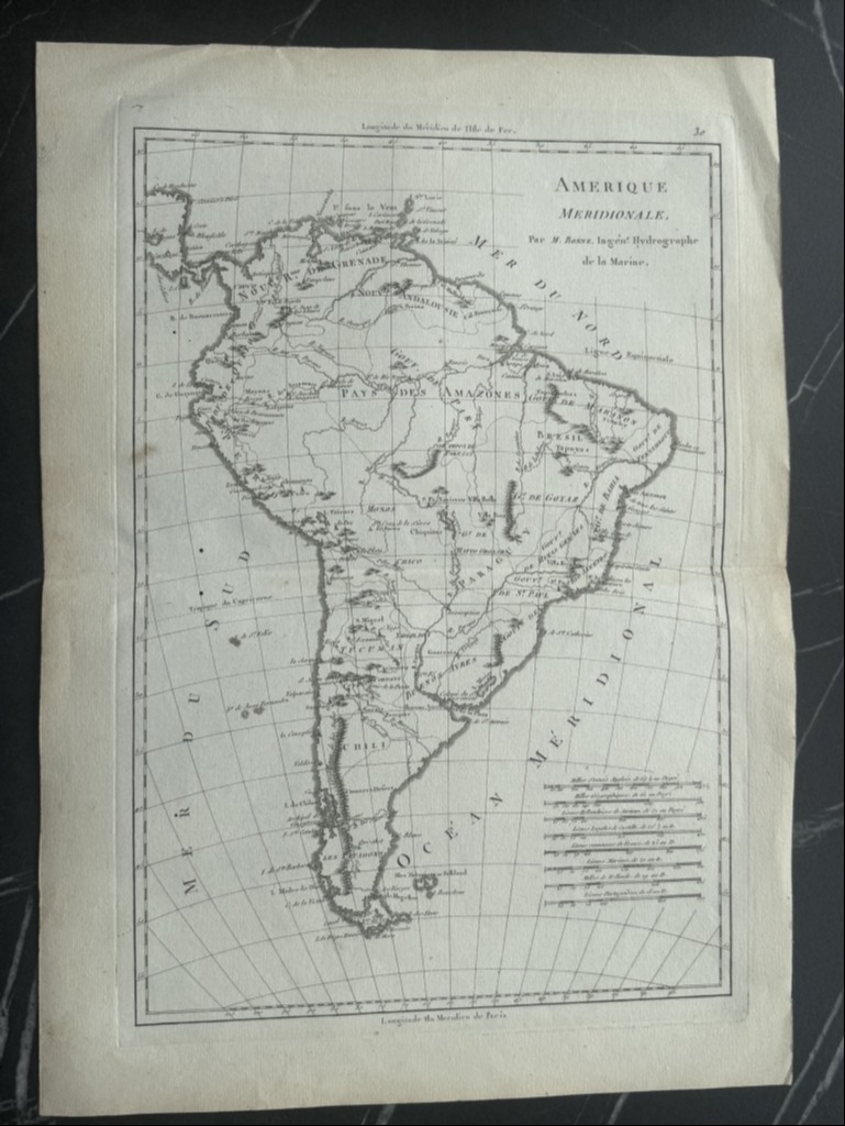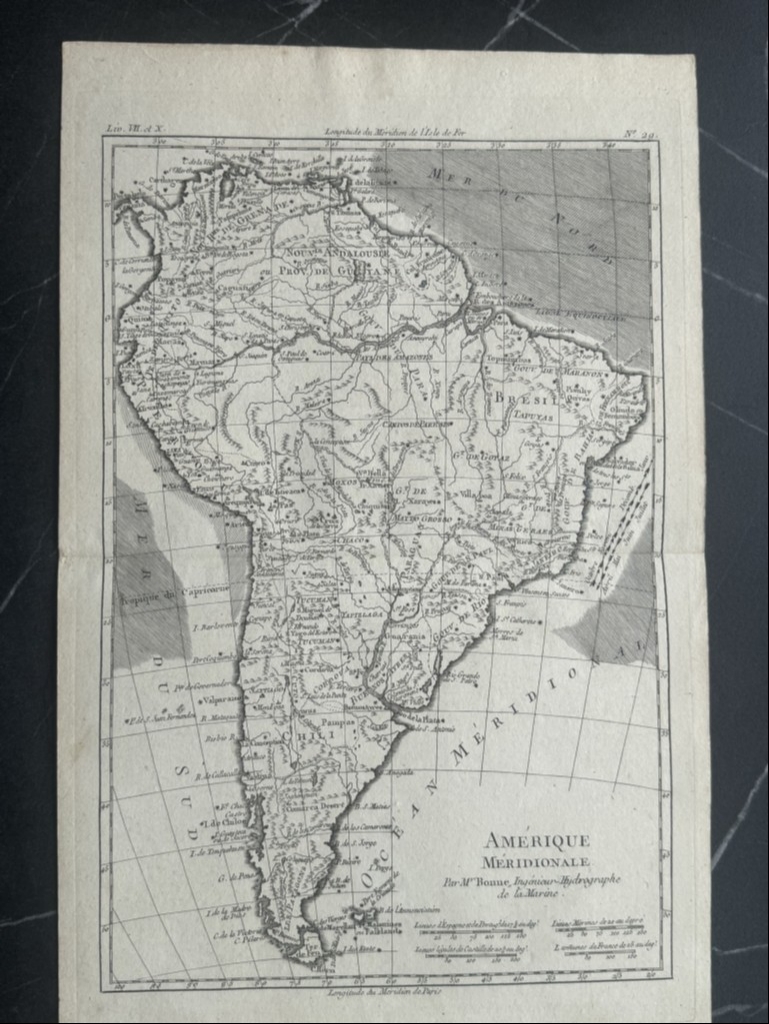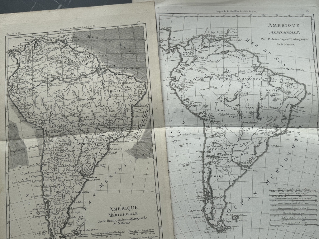 Se trata de dos mapas de América del sur al completo, obtenidos de placa de cobre realizados por el famoso cartógrafo francés, R. Bonne, muy similares, pero que poseen distinto tamaño y fueron extraídos de dos obras diferentes: uno del “Atlas encyclopedique: contenant la géographie ancienne, et quelques cartes sur la géographie du moyen age, la geographie moderne, et les cartes relatives a la géographie physique”, editado por Couret Villeneuve y el otro del "Atlas de Toutes les Parties Connues du Globe Terrestre, Dressé pour l'Histoire Philosophique et Politique des Établissemens et du Commerce des Européens dans les Deux Indes", publicado por Guillaume Thomas Raynal, en 1787 y 1789, respectivamente, en Paris.
