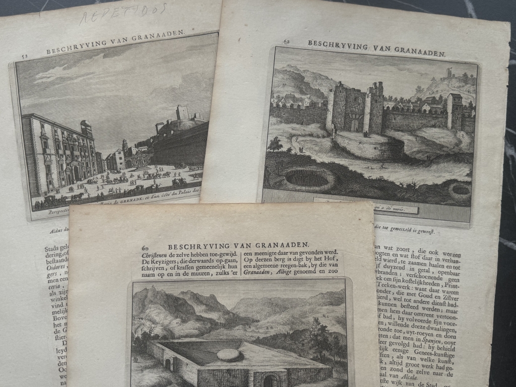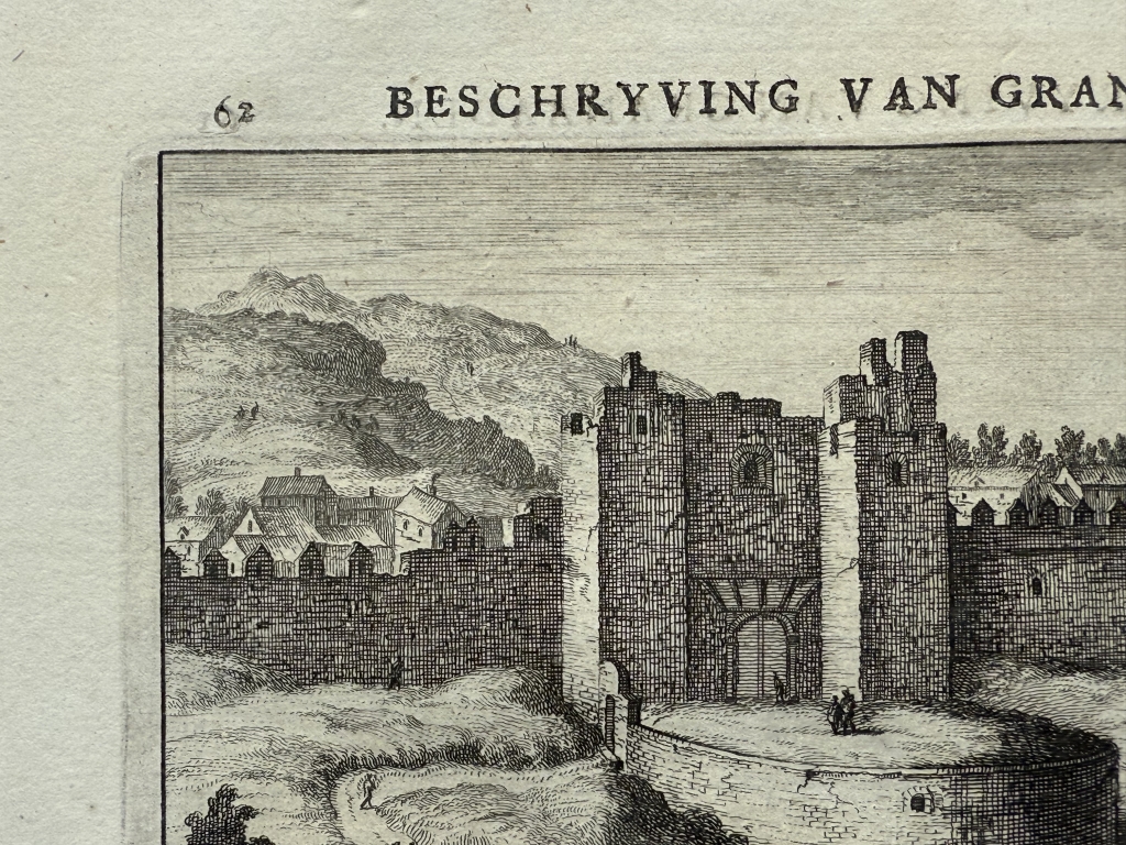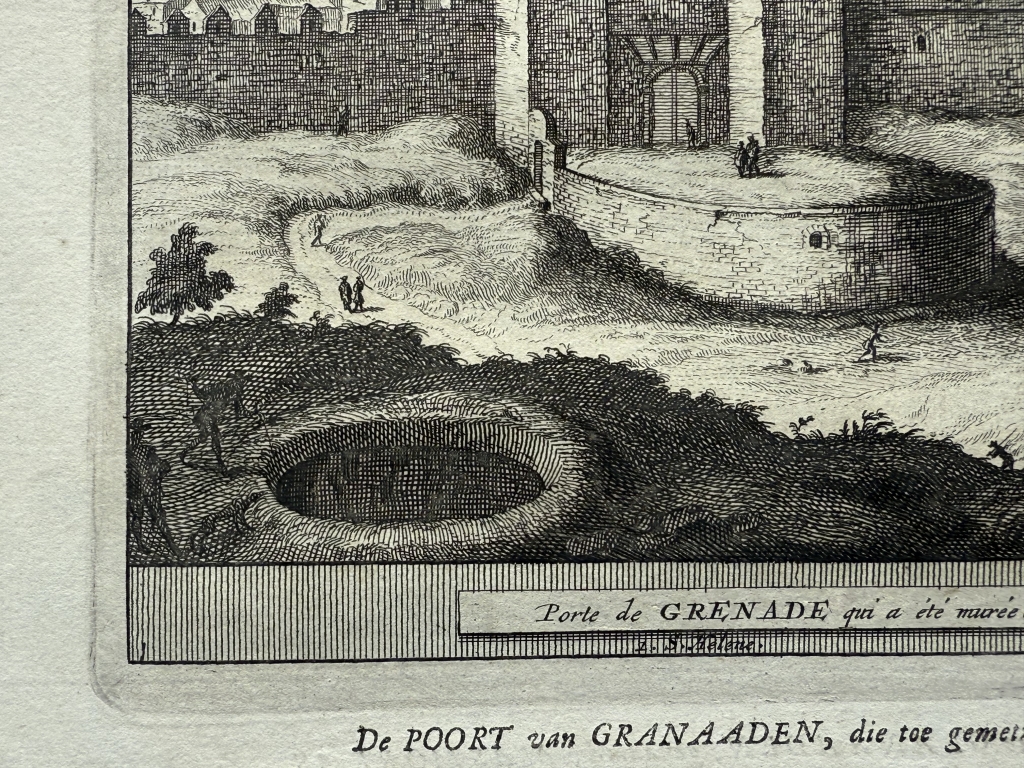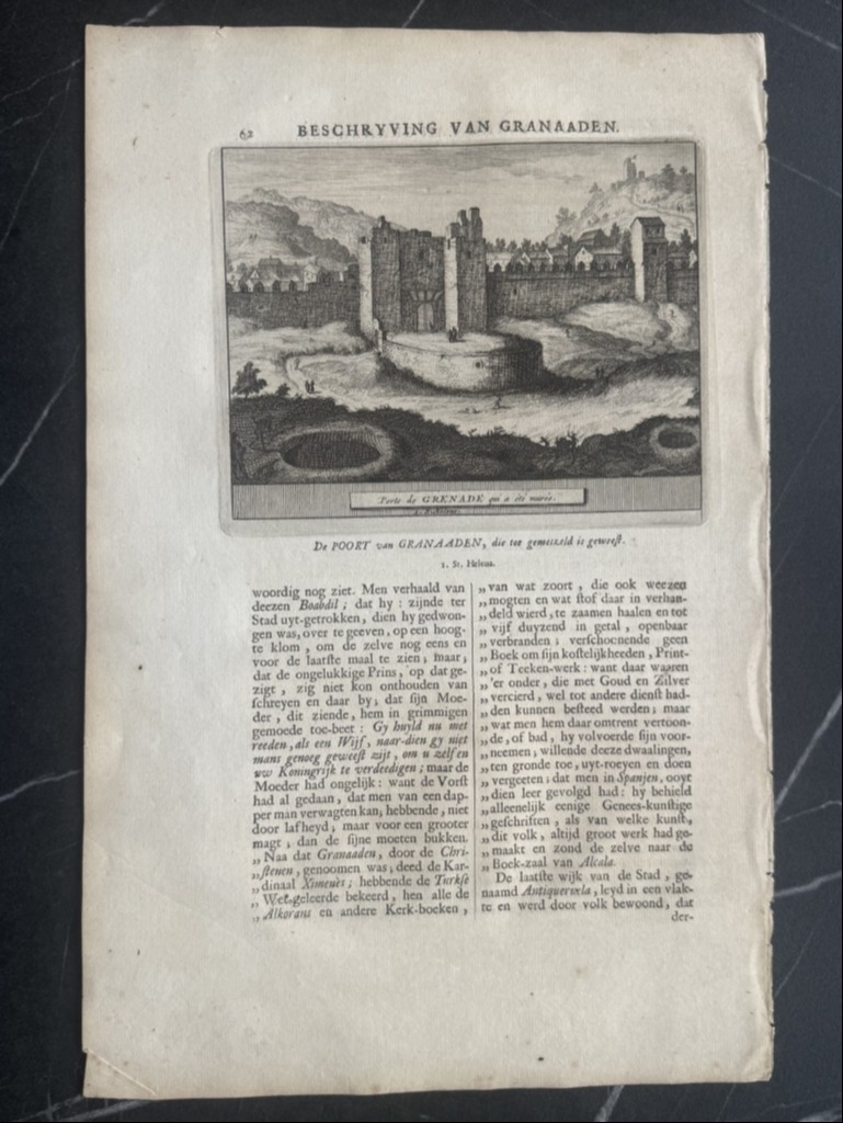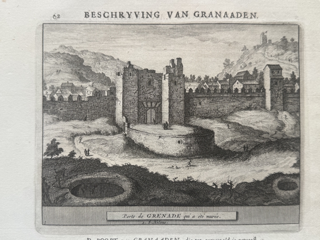 Y la última hoja, páginas 61-62, nos ofrece una visión detallada de una de las Puerta de la ciudad fortificada de Granada ( España) y en el reverso una vista de las singulares mazmorras en la misma ciudad. Bajo las ilustraciónes, podemos leer los títulos de los grabados, en francés y holandés. El texto que acompaña a las ilustraciones, está escrito en holandés, en el que se hace referencia a las ilustraciones.