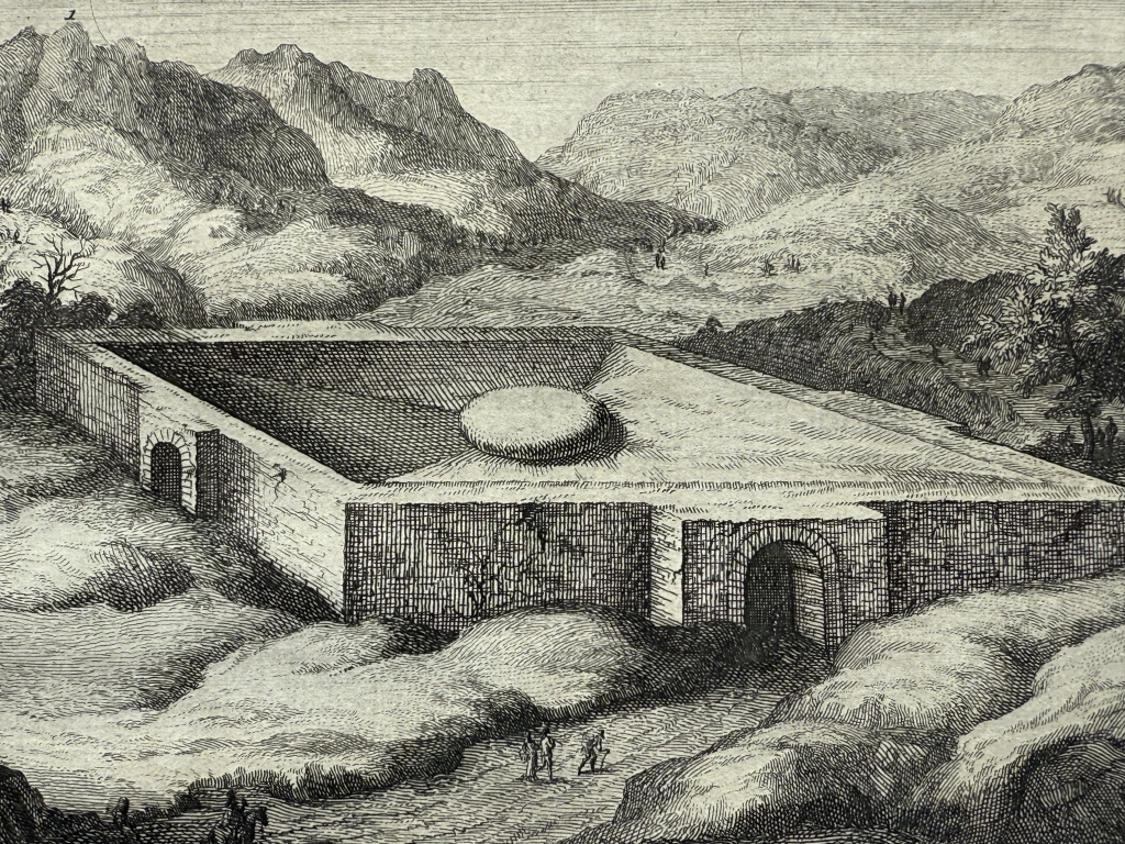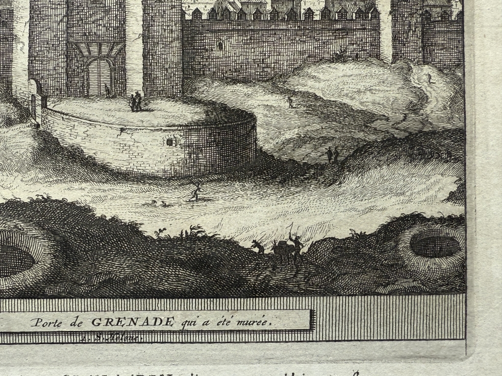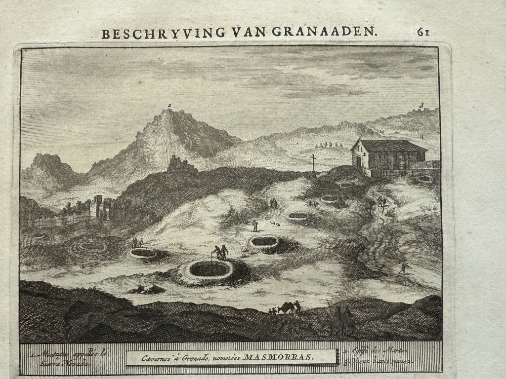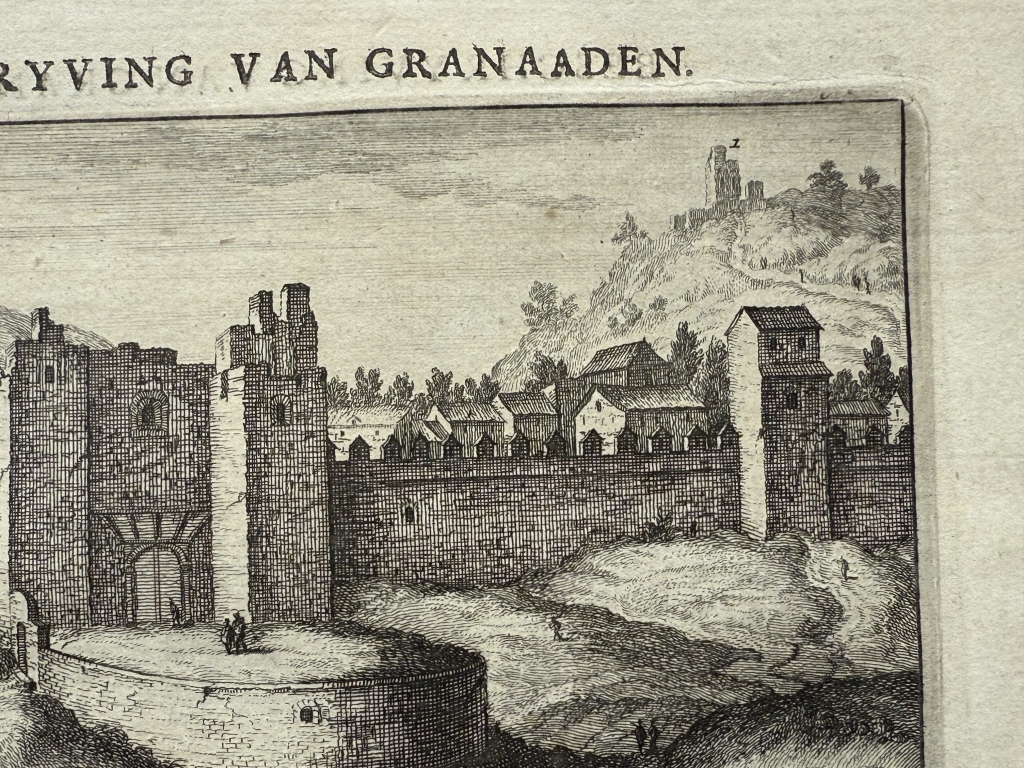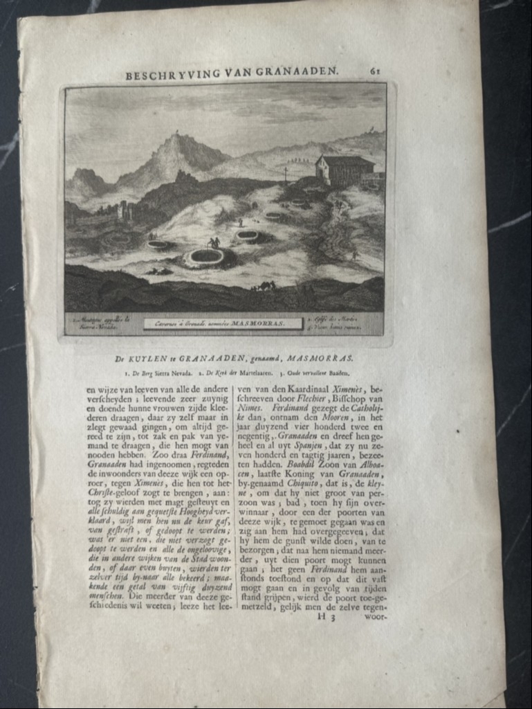 Y la última hoja, páginas 61-62, nos ofrece una visión detallada de una de las Puerta de la ciudad fortificada de Granada ( España) y en el reverso una vista de las singulares mazmorras en la misma ciudad. Bajo las ilustraciónes, podemos leer los títulos de los grabados, en francés y holandés. El texto que acompaña a las ilustraciones, está escrito en holandés, en el que se hace referencia a las ilustraciones.