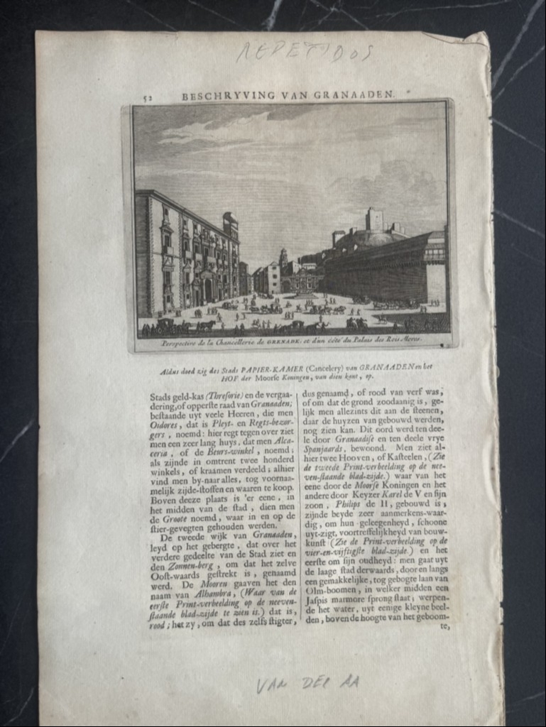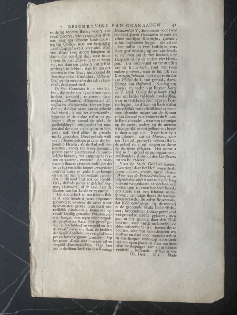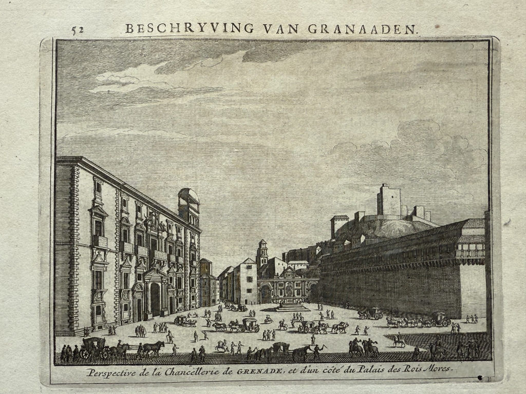 La primera hoja, corresponde a las páginas 51 y 52: la primera pose todo texto en holandés y en la siguiente se nos muestra una bella vista de la real Cancilleria y a su lado, el antiguo Palacio de los Reyes Moros, en Granada, Andalucía ( España) , edificios renacentistas, con elementos barrocos. Bajo la ilustración, podemos leer el título del grabado. El pié del grabado está en francés y holandés. El texto que acompaña a la ilustración , está escrito en también en holandés, en el que se hace referencia a la ilustración.
