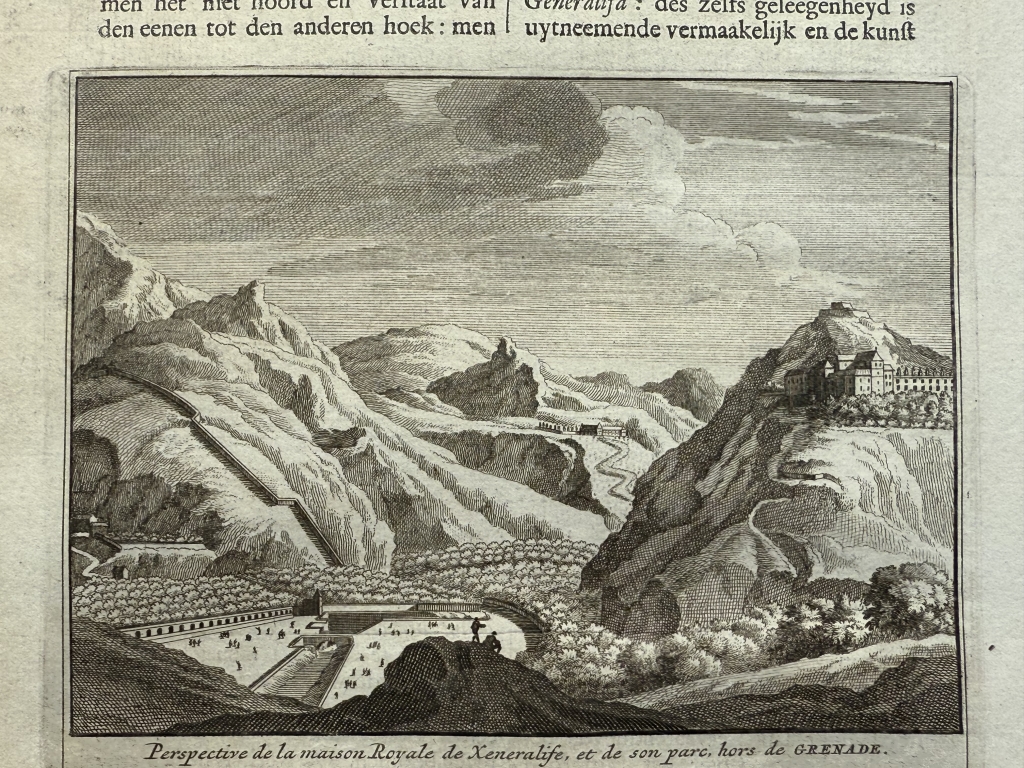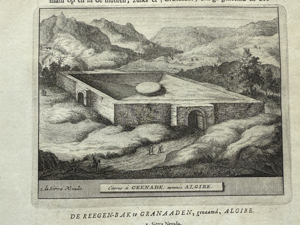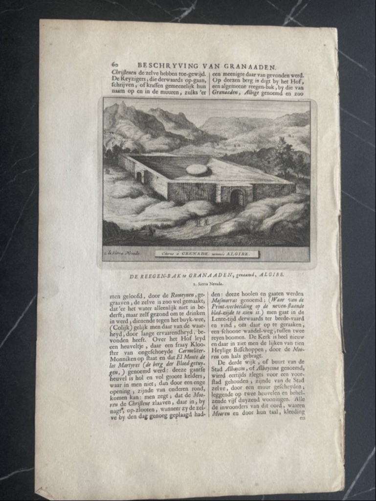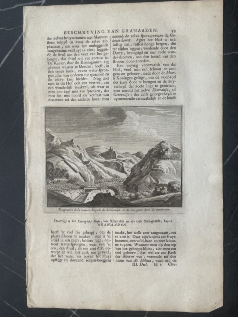 La segunda hoja, páginas 59 y 60, nos muestran dos grabados: uno corresponde a una vista y perspectiva del Palacio del Generalife en Granada ( España) en lo alto de una montaña y en el reverso, una vista de uno de los aljibes o cisternas ( depósitos de agua) de Albaicín en la misma ciudad. Bajo las ilustraciones, podemos leer los títulos de los grabados en francés y holandés . El texto que acompaña a las ilustraciones, está escrito en holandés, en el que se hace referencia a las ilustraciones.