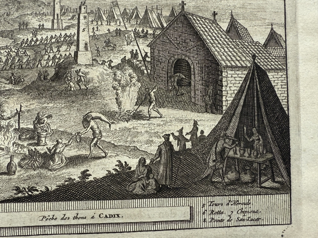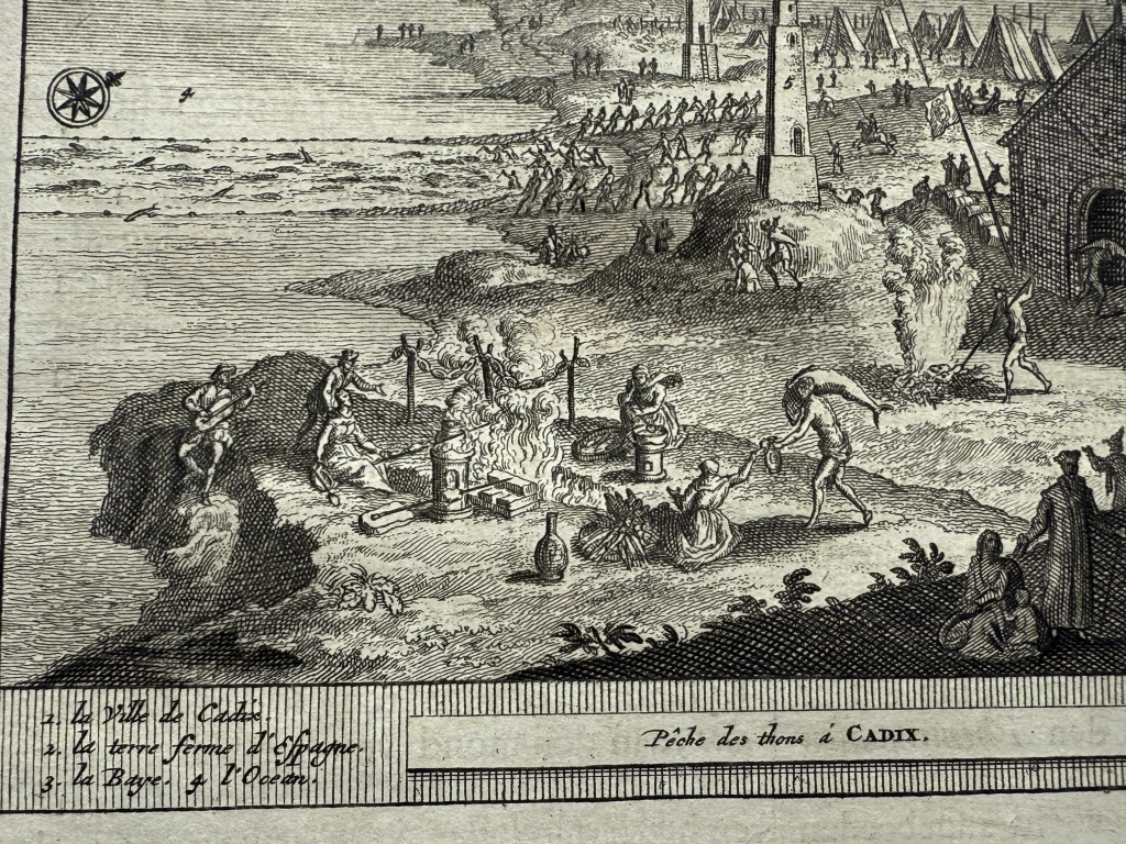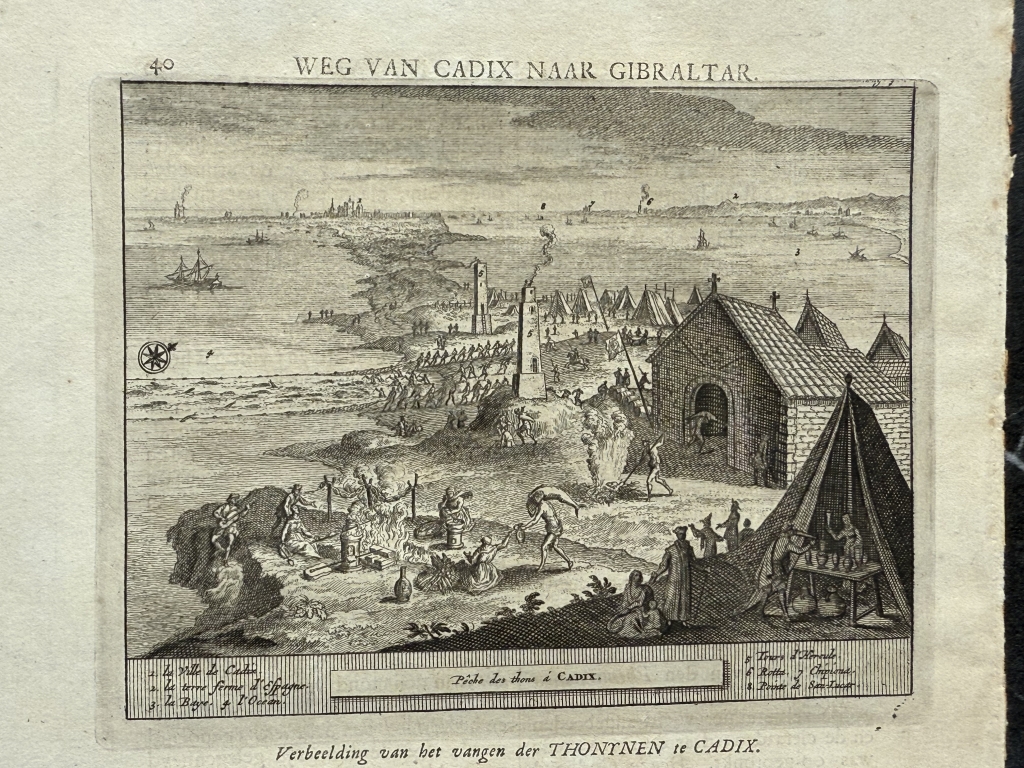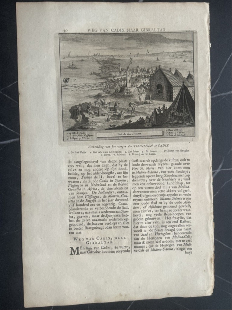 Lo que se nos muestra en este bello grabado con el título “La pesca de los atunes en Cádiz”(ya traducido), el puerto y ciudad de Cadiz y el trabajo que desempeñaban los marineros en la pesca del atún por el famoso y antiguo sistema de pesca denominado "de la almadraba".. Así apreciamos la captura con las redes, los utensilios y la vestimenta de los operarios que realizaban dichas tareas en la pesca del atún en Cádiz (Andalucía,España), con todo lujo de detalle, así como los procesos realizados con los mismo, luego ya en tierra.. . Bajo la ilustración del anverso y el reverso, tiene un texto que está escrito en holandés, en el que se hace referencia al grabado. Es interesante le representación de lo que luego denomina “las torres de Hércules”.