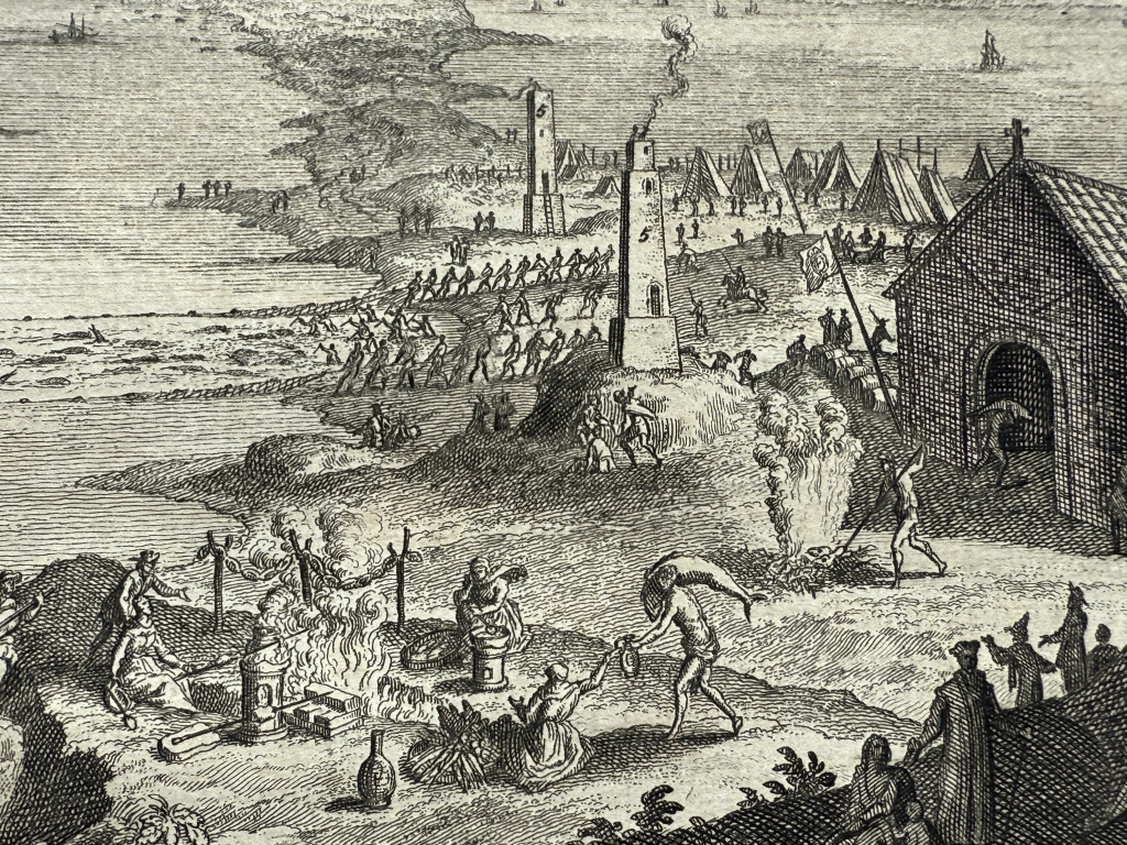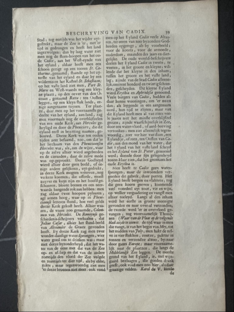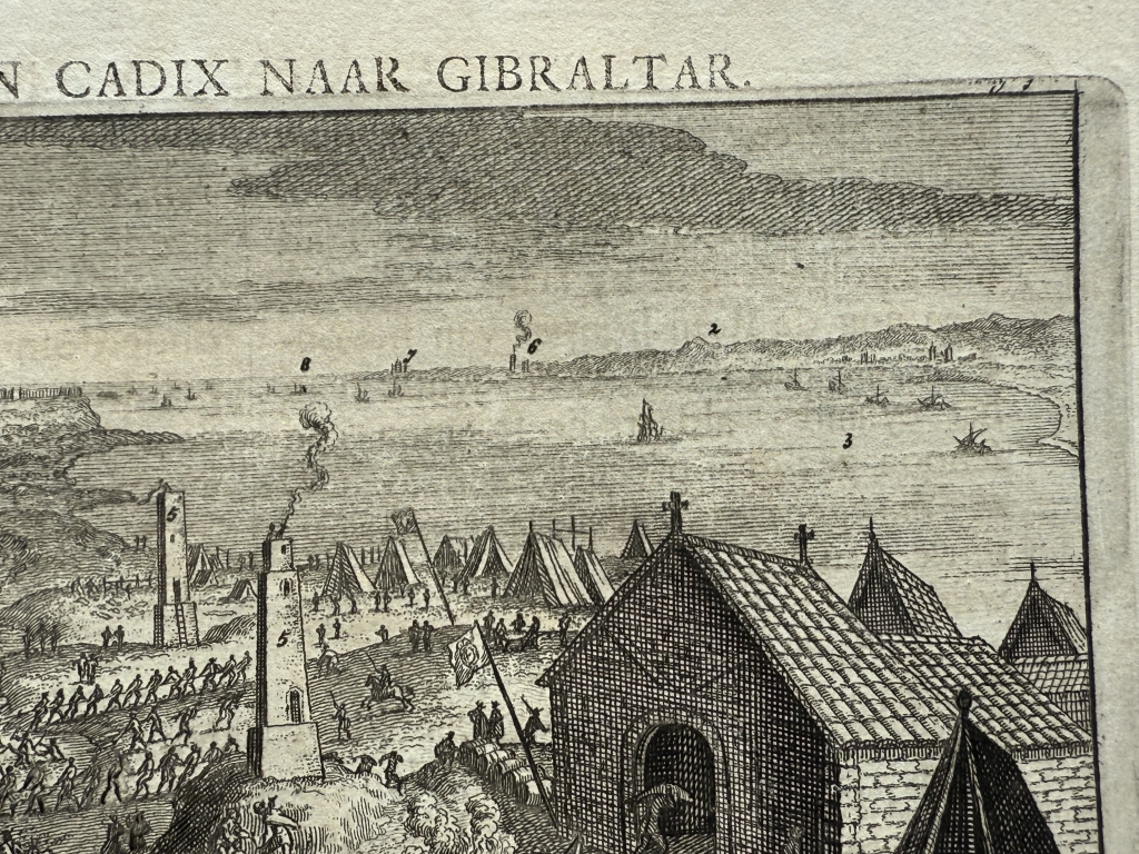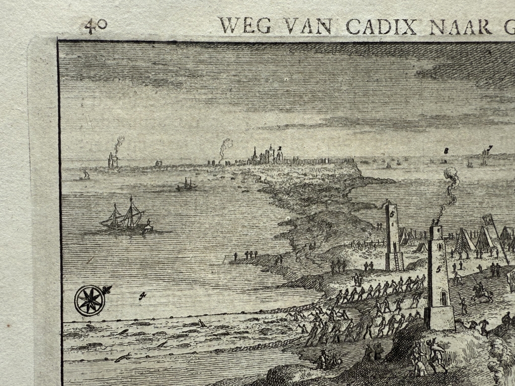 Lo que se nos muestra en este bello grabado con el título “La pesca de los atunes en Cádiz”(ya traducido), el puerto y ciudad de Cadiz y el trabajo que desempeñaban los marineros en la pesca del atún por el famoso y antiguo sistema de pesca denominado "de la almadraba".. Así apreciamos la captura con las redes, los utensilios y la vestimenta de los operarios que realizaban dichas tareas en la pesca del atún en Cádiz (Andalucía,España), con todo lujo de detalle, así como los procesos realizados con los mismo, luego ya en tierra.. . Bajo la ilustración del anverso y el reverso, tiene un texto que está escrito en holandés, en el que se hace referencia al grabado. Es interesante le representación de lo que luego denomina “las torres de Hércules”.