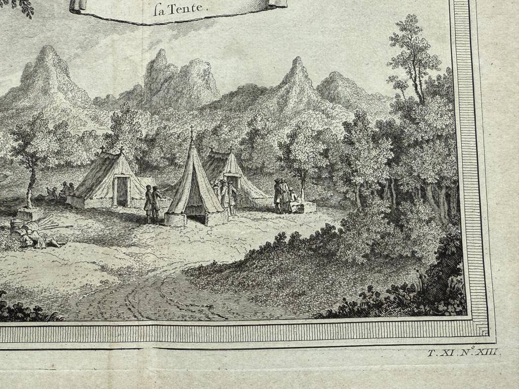 Se trata de una hoja en cuyo dibujo podemos ver representada un antiguo campamento en la isla de Juan Fernández (Chile, América del sur), donde se observan, varias tiendas de campaña, junto con varios grupos de personas, así como otra figura más en primer plano, oculta tras los árboles. Cuenta con numerosos detalles, vegetación y un grupo de montañas al fondo. en la parte superior posee una cartela en cuyo interior se puede leer el título de la ilustración escrito en francés.