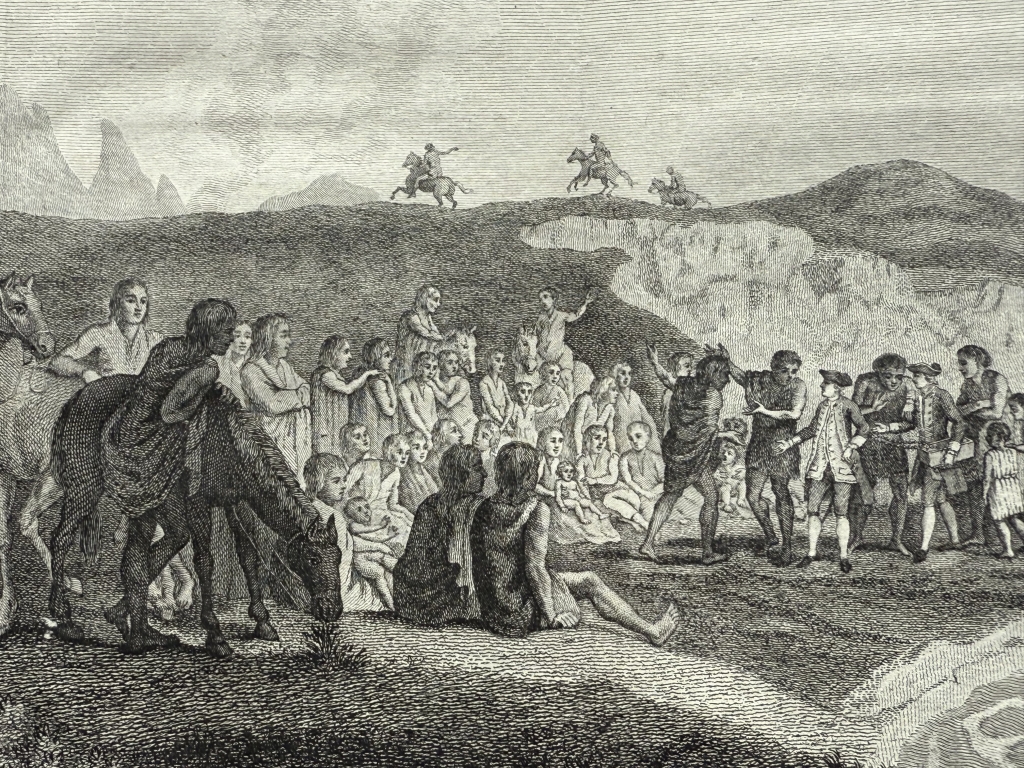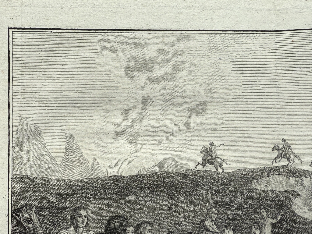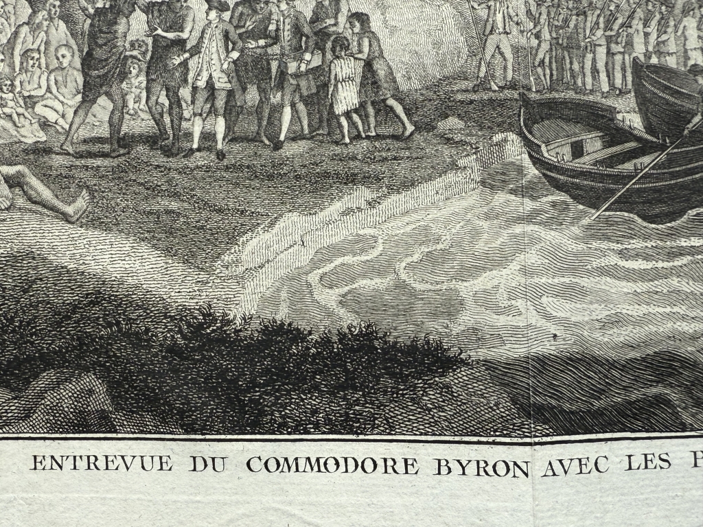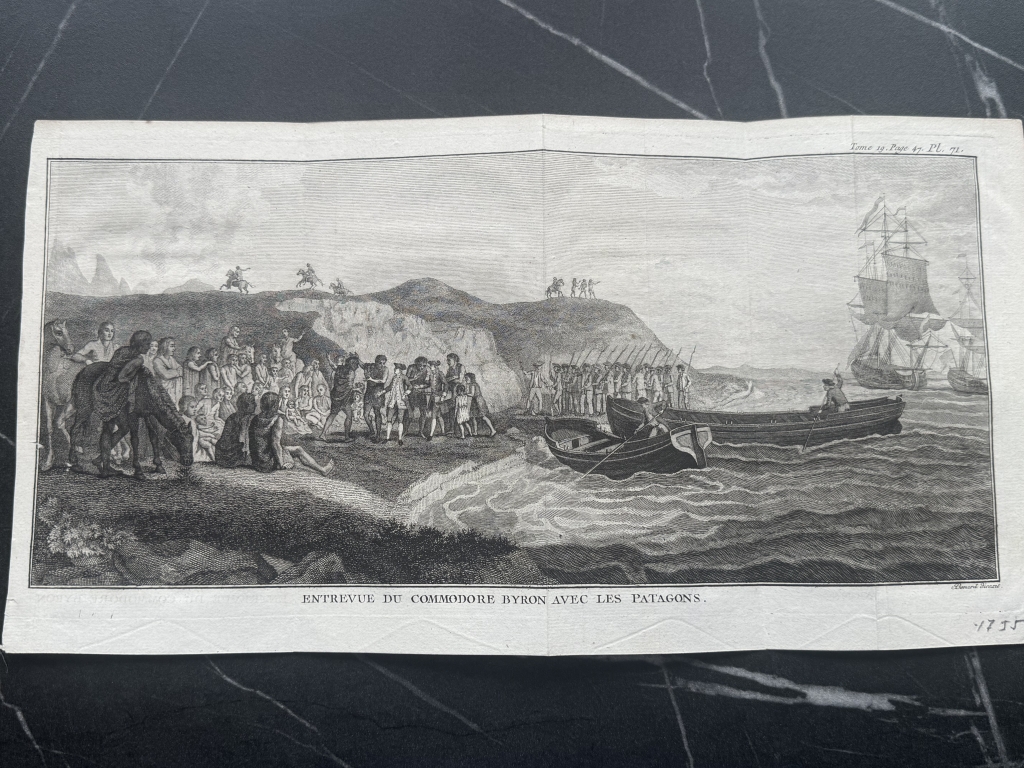 En este grabado histórico de gran formasto, como bien dice su título se nos muestra la reunión o entrevista que tuvo el almirante John Byron (1723-1786) de la citada expedición marina, con una tribu de patagones, situados como se sabe la parte más austral de América del sur