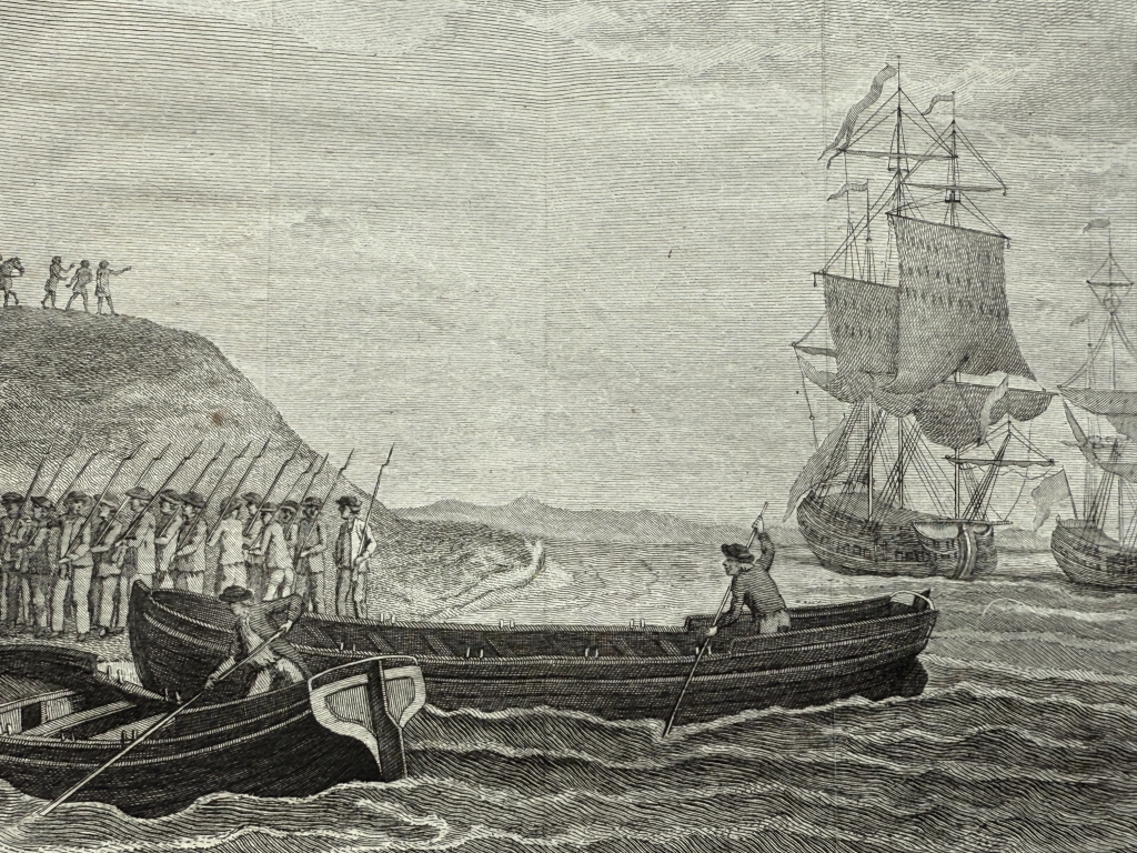 “Este hecho histórico se nos muestra en formato rectangular y disposición horizontal, en una composición monocroma que representa un paisaje con una serie de personas junto a una playa; en primer plano, ubicado a la izquierda de la obra, sobre un promontorio hay dos personas sedentes de espalda observando hacia la playa, también hay dos caballos junto otros hombres; en segundo plano, aparecen una serie de personas conglomeradas en torno al grupo principal, formado por hombres de aspecto europeo, junto a estos hay dos embarcaciones menores y en el plano posterior se visualiza un gran barco con sus velas desplegadas; y sobre la playa, a la distancia, se observa una formación militar, con fusiles sobre sus hombros.”