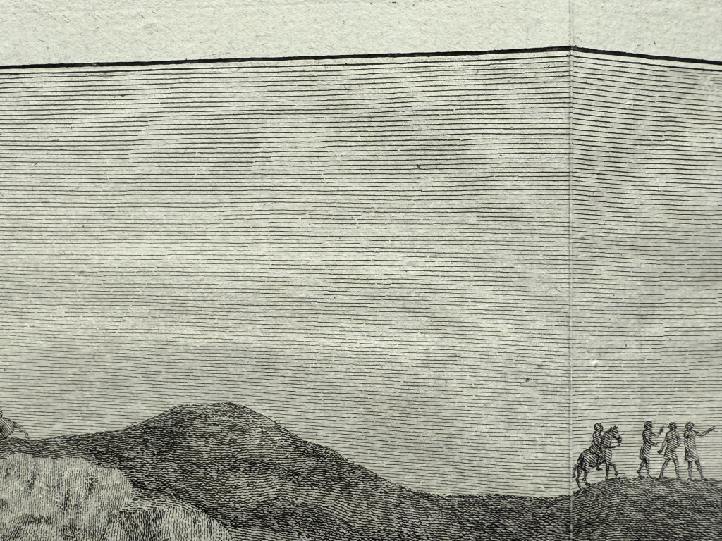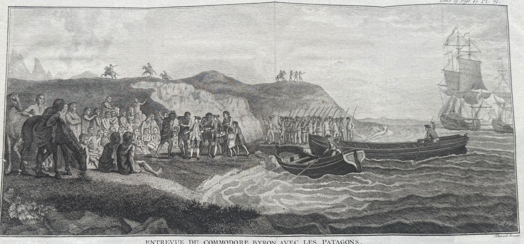 “La escena representa el encuentro de Byron con los “gigantes” patagones. La leyenda sobre su estatura se originó en el viaje de Magallanes en la década de 1520 cuando dio con una raza de gigantes que bautizó “patagones” por el tamaño de sus pies, según nos refiere Pigafetta en su relato. Otros informes levantados por Francis Fletcher, capellán de Sir Francis Drake, y Anthony -o Antonie- Knivet, insistieron en esa idea; lo mismo que los capitanes Harrigton y Carmen, a principios del siglo XVIII. “