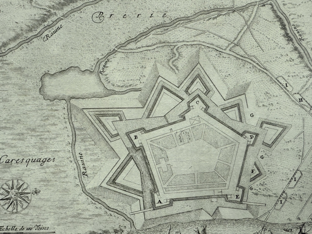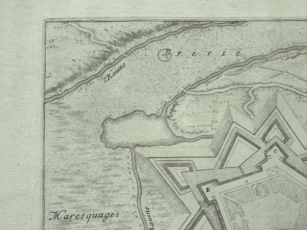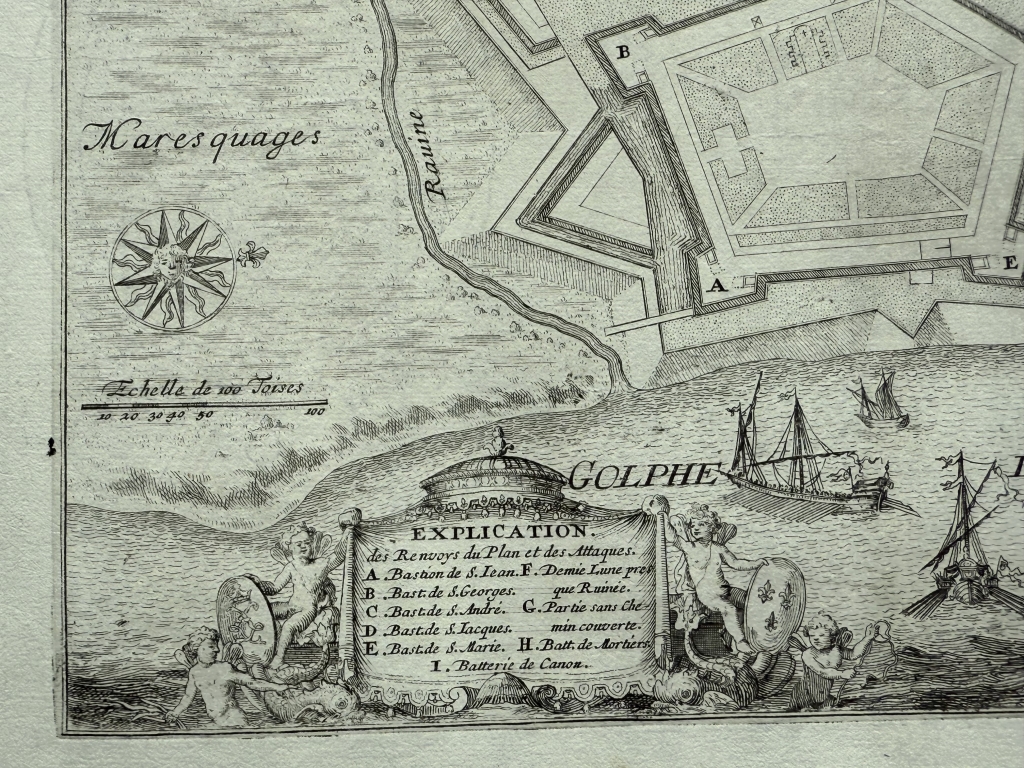 Mapa grabado en placa de cobre, realizado por el cartógrafo y geógrafo francés Nicolás De Fer, extraído de la obra "Les forces de l'Europe, ou description des Principales Villes, avec leurs fortifications", y publicado en el año 1693, en Paris. Grabado por P. de Pautre.