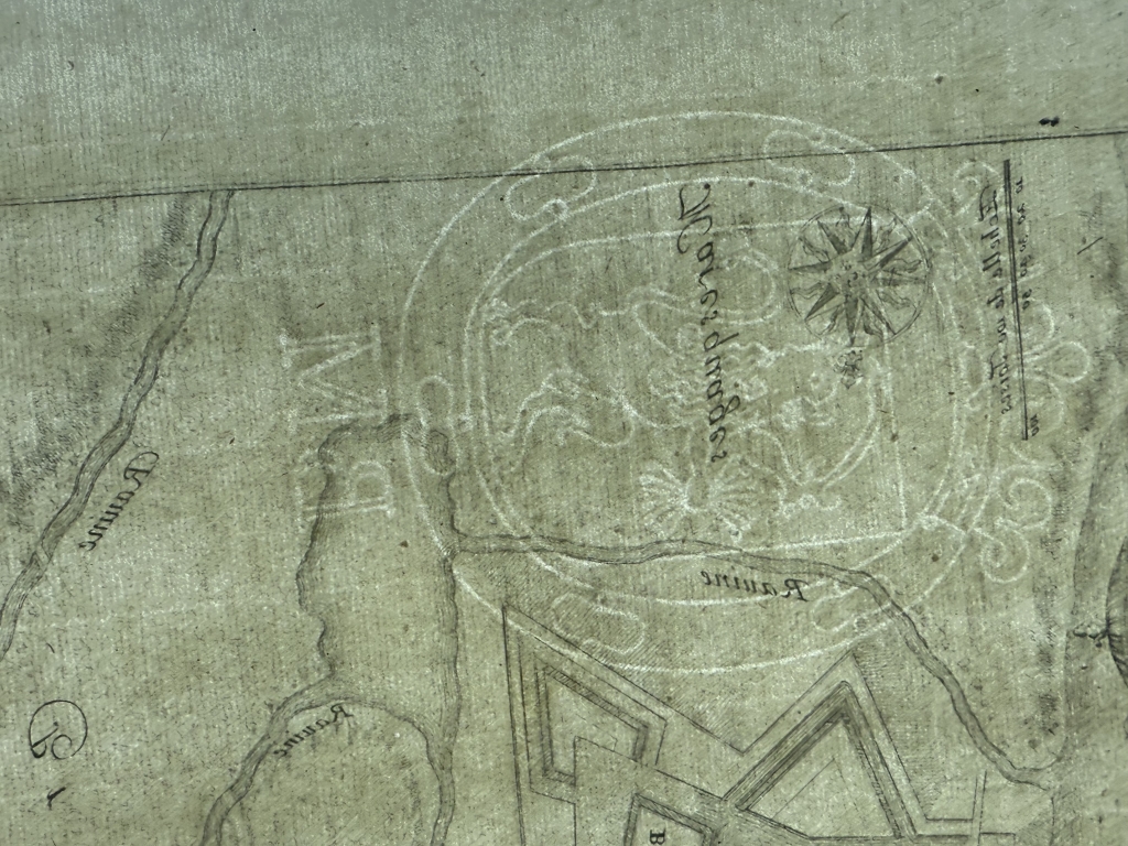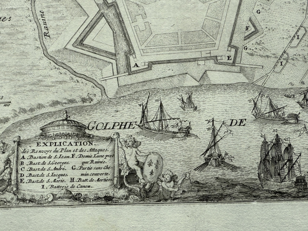 En su cuadrante superior derecho posee una decorada cartela adornada con un escudo heráldico y en el interior de la cual podemos leer datos relativos al grabado y en primer plano podemos ver un grupo de embarcaciones, una cartela con la explicación de los distintos puntos y una Rosa de los Vientos.