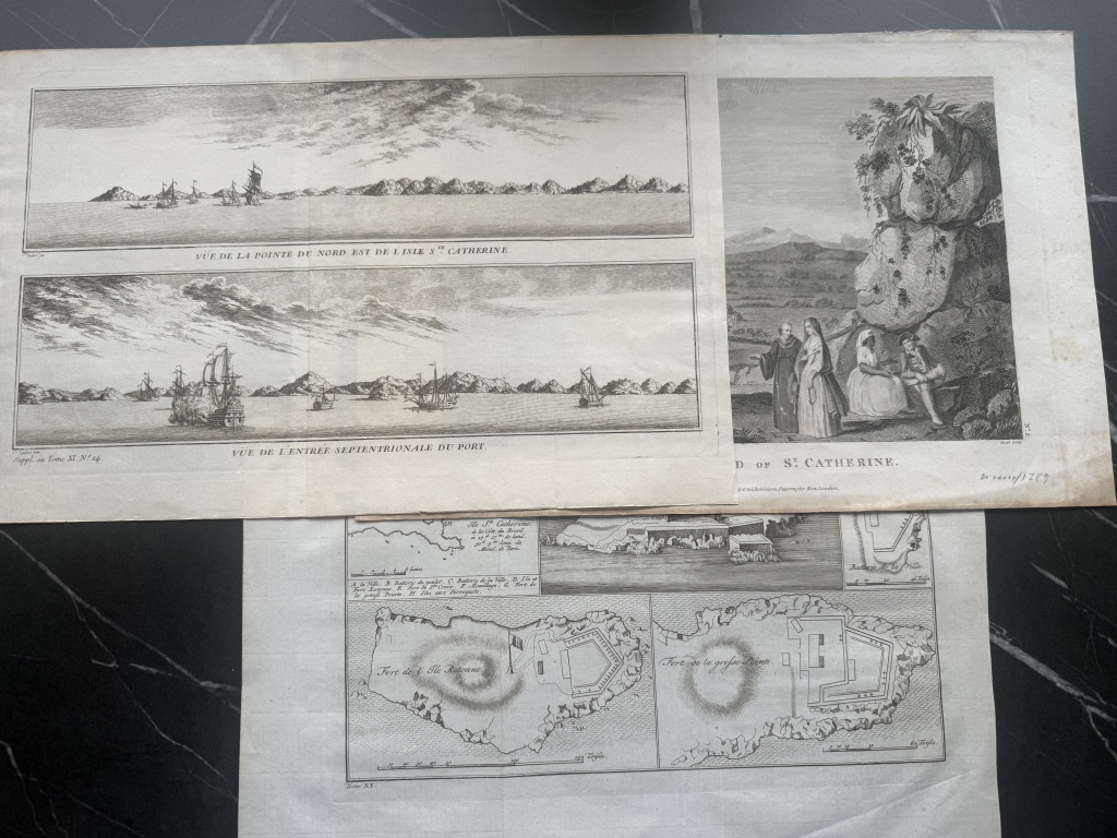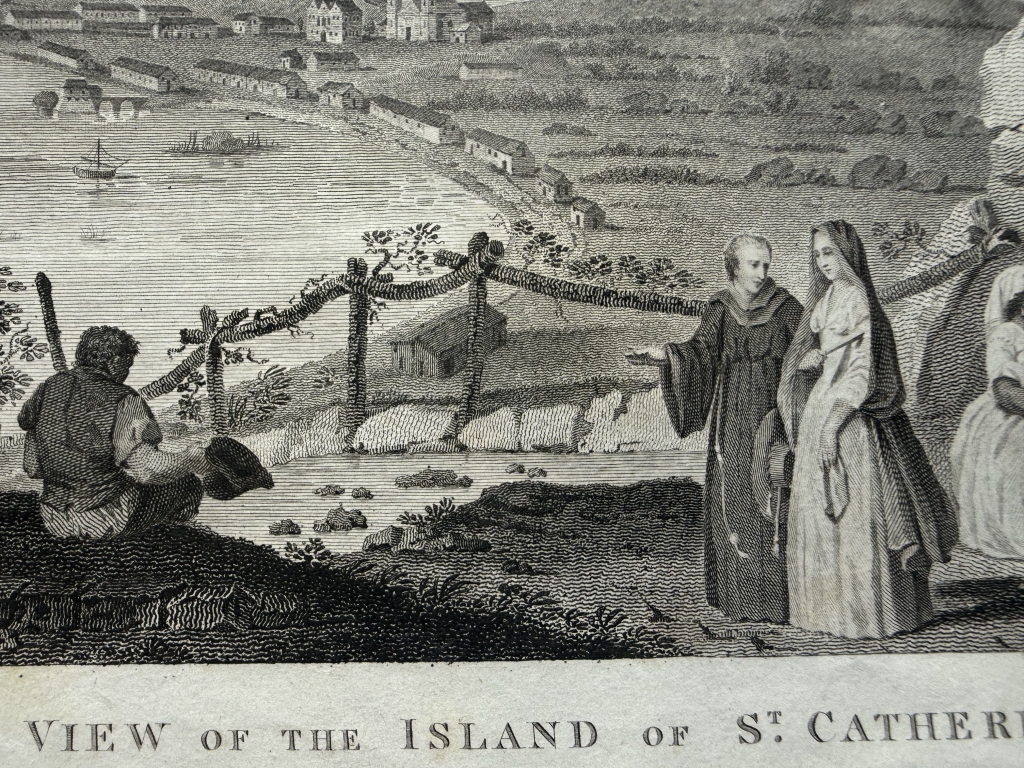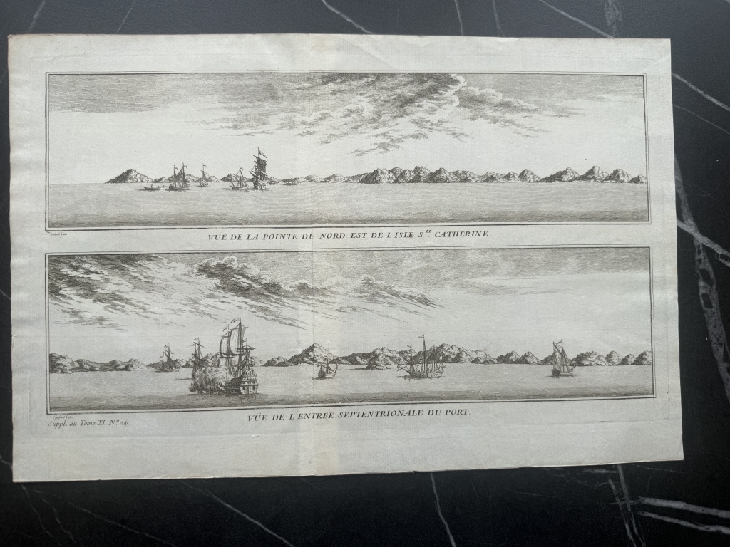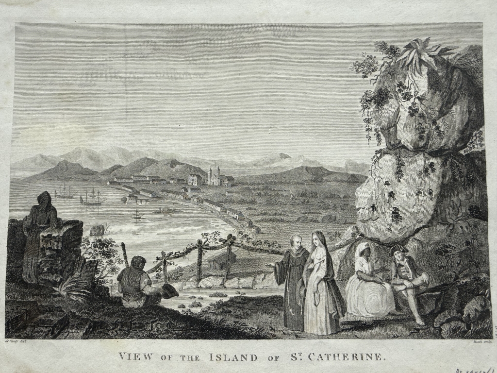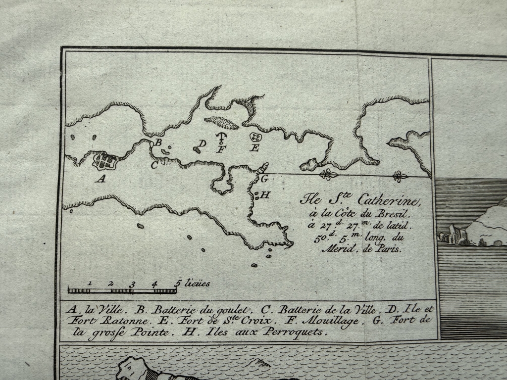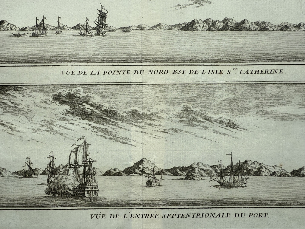Se trata de un grabado con numerosos detalles, en el que en una sola pieza de papel se aprecian dos panorámicas costeras de la isla de Santa Catarina (Brasil, América del sur)), , y adornado en primer plano con numerosos navíos.