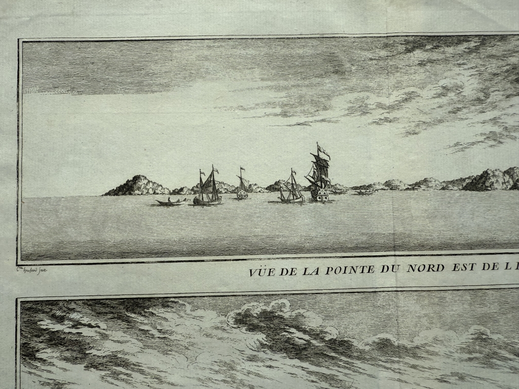 El primero, nos muestra en la misma lámina, dos vistas panorámica distintas de dicha isla, tomadas desde el mar, realizadas por N. Bellin y publicadas por Prevost en su conocida obra “Historie Generale des Voyages,..” editada en 1754.