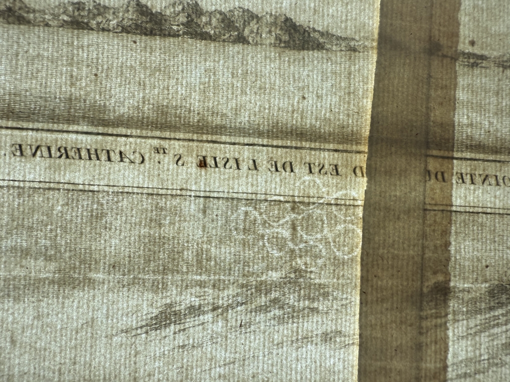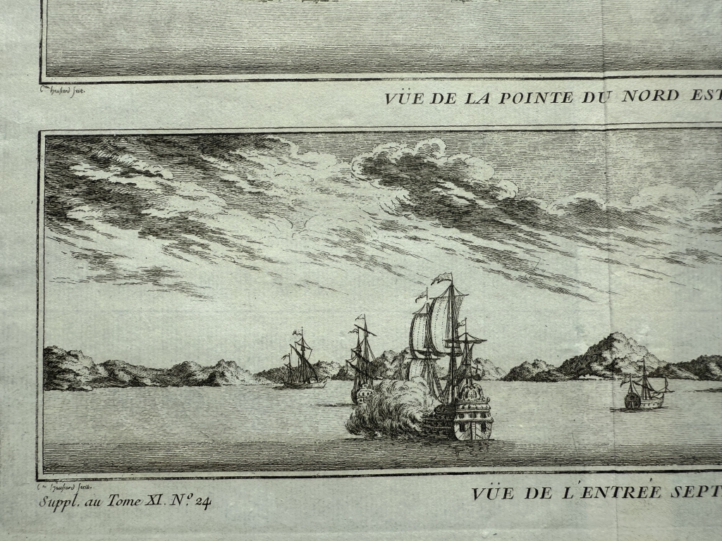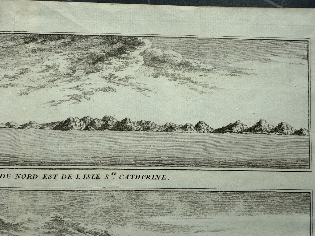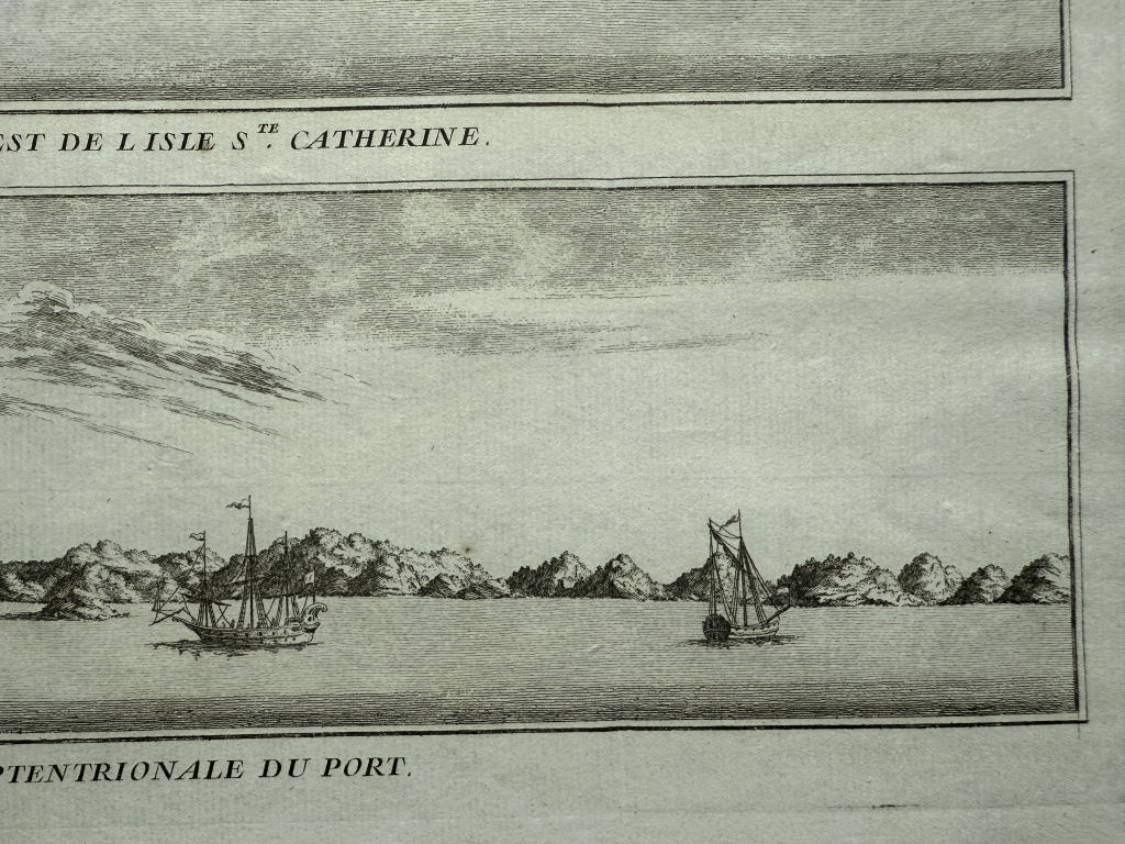 Grabado en placa de cobre, realizado por el cartógrafo francés, Nicolás Bellin, que muestra dos vistas panorámicas de la costa norte de la isla de Santa Catarina y de la entrada septentrional al puerto, ubicada al sur de Brasil. Fue extraído de la conocida obra de Prevost, "Histoire Generale des Voyages...", editada en Paris en 1754. En los márgenes de los dos dibujos, se puede leer el autor del dibujo.
