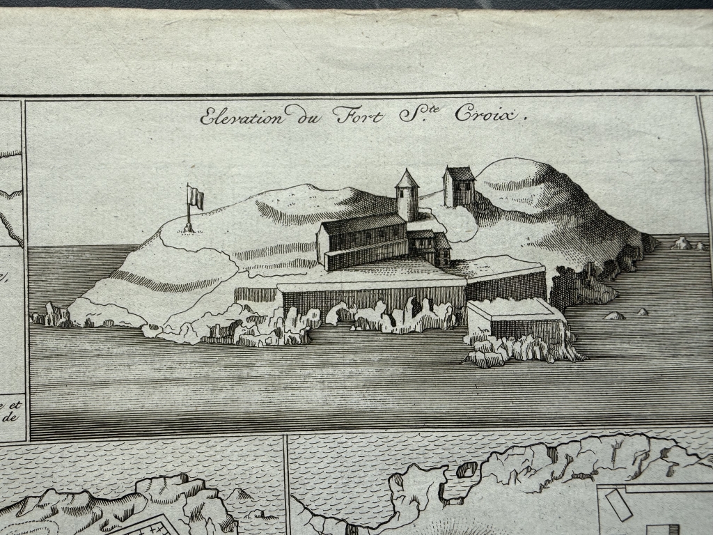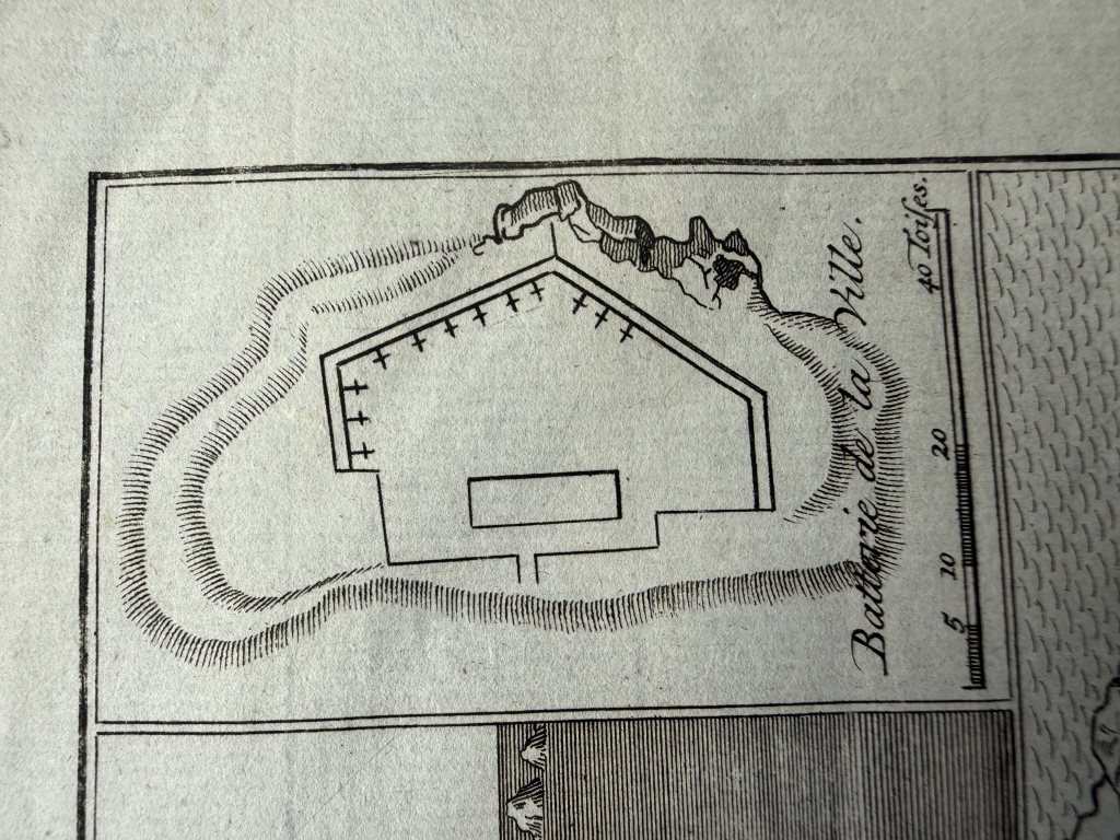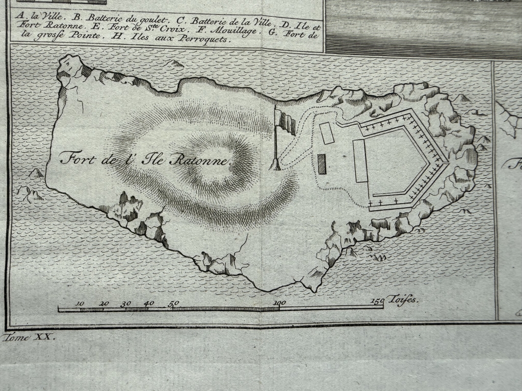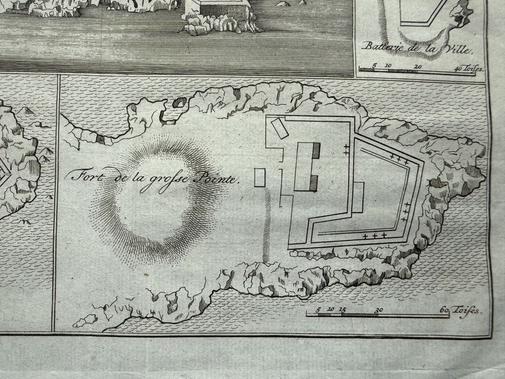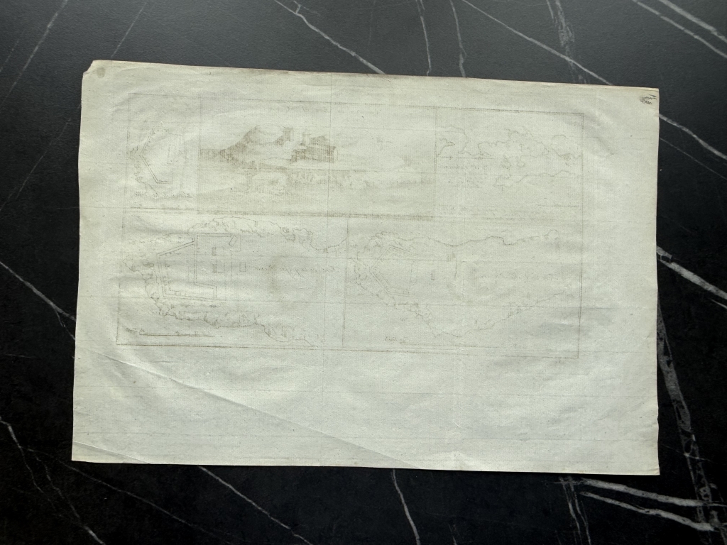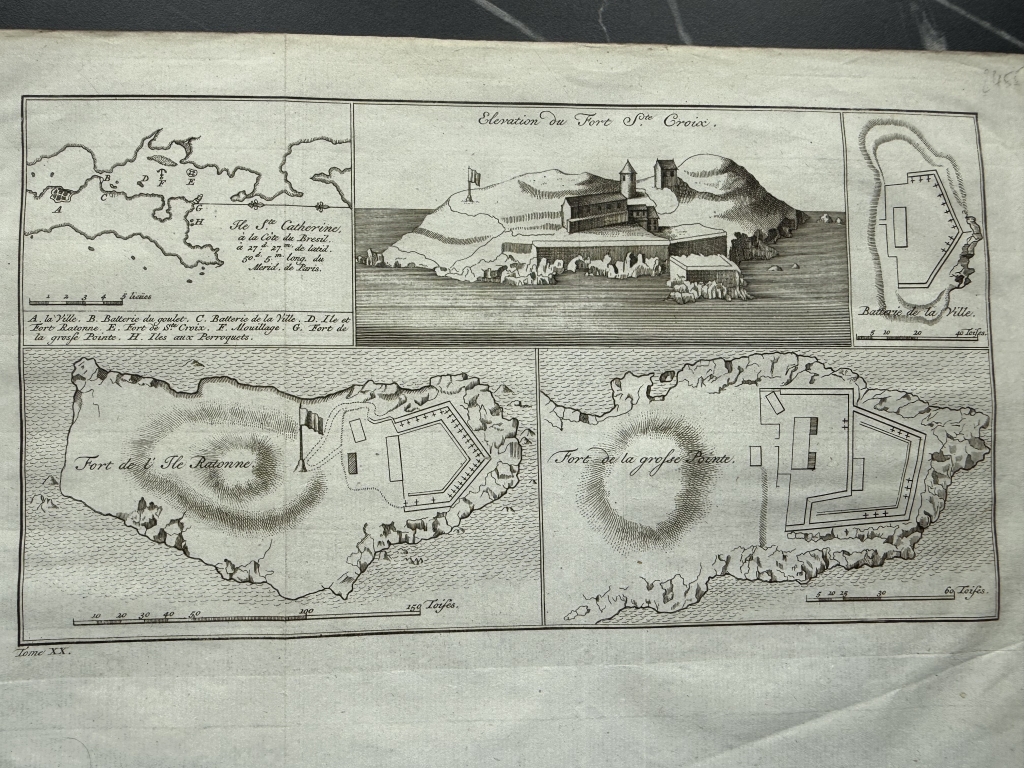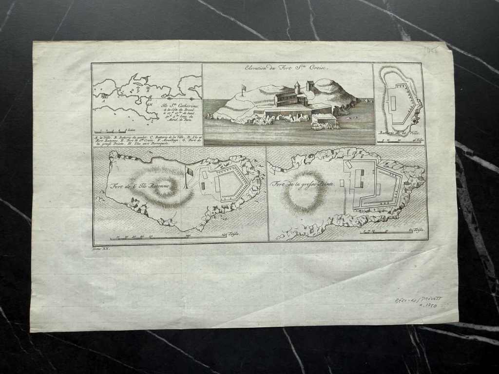El siguiente, nos muestras las diferentes fortificaciones que poseía esta isla en la época y el autor y editor son los mismos, pero su edición es de 1750.