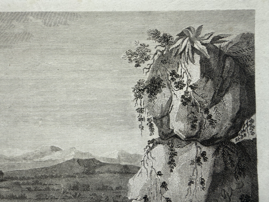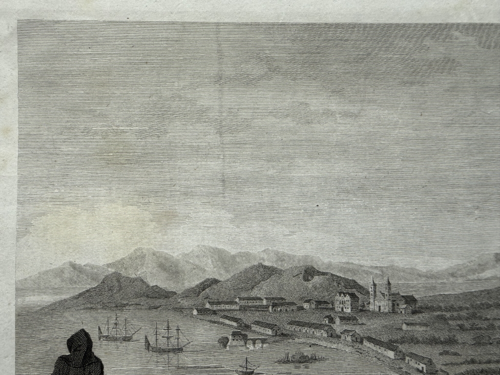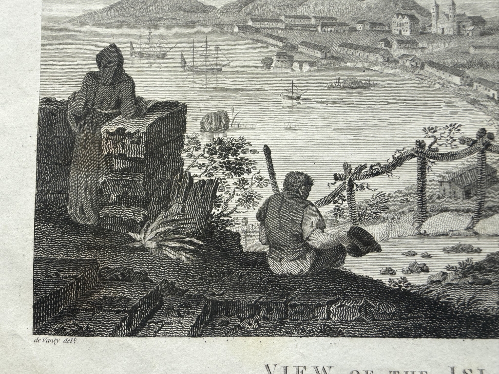 Por último, en la tercera podemos apreciar una bella vista panorámica de la zona central de la isla y en donde está situada su población las importante, destacándose sus edificios más relevantes y en primer término podemos observar varios personajes en su vida cotidiana. Procede de la famosa obra del cartógrafo y viajero francés Jean-François de Galaup La Pérouse, Comte de Pérouse, titulada "Voyage of M. La Perouse arround the World" y publicado en Londres por los editores G.G. & I. Robison en 1798. Es sin duda es una edición rara de esta publicación ya en lengua inglesa.