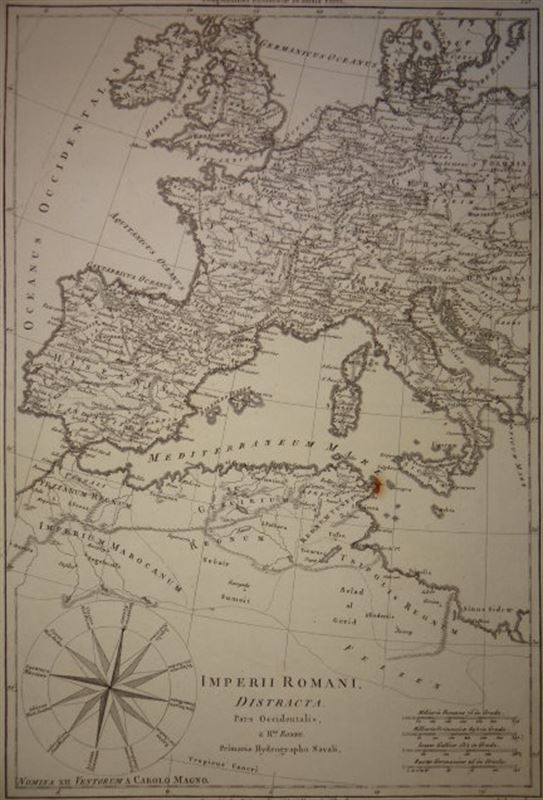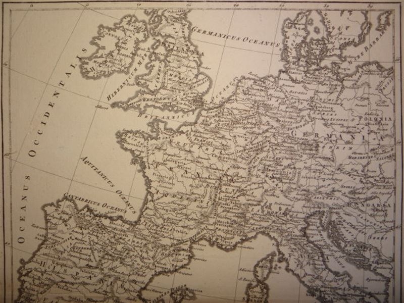 Esta detallada cartografía histórica, representa el Imperio Romano Occidental: Europa occidental y abarca el norte de Africa, desde Marruecos hasta la parte oeste de Libia, se completa con la señalización de las divisiones territoriales de la época, así como las poblaciones y accidentes geográficos más importantes, ciudades, pueblos, ríos, lagos, montañas...