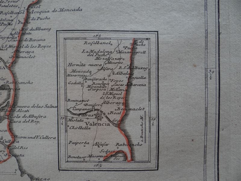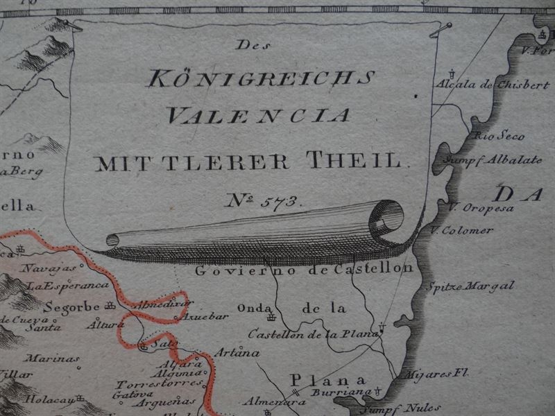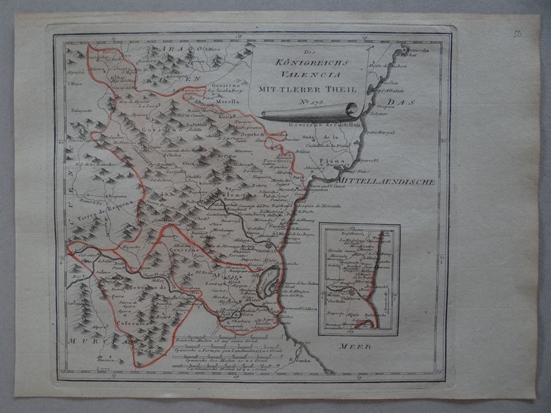 Se trata de una cartografía, parcialmente coloreada, con líneas que delimitan distintos tipos de áreas administrativas de la época y que muestra la parte norte de Valencia (España), en la que podemos encontrar señalizados numerosos detalles topográficos y geográficos como las divisiones territoriales del momento, ciudades, pueblos, ríos, montañas...en su margen inferior-izquierdo, posee un detalle de la zona la ciudad de Valencia y alrededores.