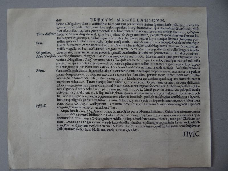 Se trata de una cartografía de pequeñas dimensiones que representa el Estrecho de Magallanes, en América del Sur (pasa por Argentina y Chile), que une el Océano Atlántico con el Pacífico, en la que aparecen señalizados numerosos detalles topográficos y geográficos relevantes en la época. En su cuadrante inferior derecho posee una decorada cartela en cuyo interior figura el título del grabado, y hacia la izquierda de la misma el detalle de la escala de medidas utiizada en su elaboración. En el reverso posee un texto escrito en latín, relativo al grabado.