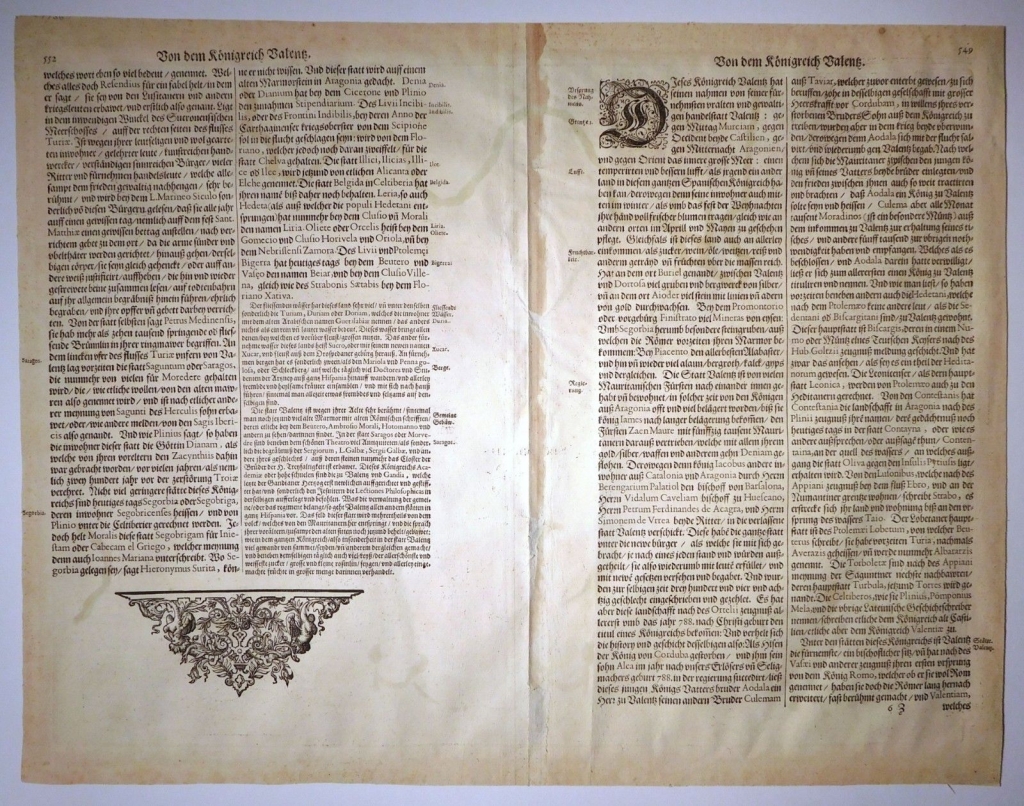 Se trata de una cartografía del antiguo reino de Valencia (España), junto con sus zonas limítrofes, en la que aparecen señalizados numerosos detalles topográficos y geográficos relevantes en la época, núcleos de población, ciudades, ríos, montañas... En su cuadrante inferior central posee una decorada cartela en cuyo interior figura el título del grabado y a la izquierda de esta el detalle de la escala de medidas utilizada en su elaboración. Decorado con un navío y un "monstruo marino". En el reverso posee un texto escrito en alemán antiguo, relativo al grabado, con un pequeño grabado al final del texto y letra inicial decorada.