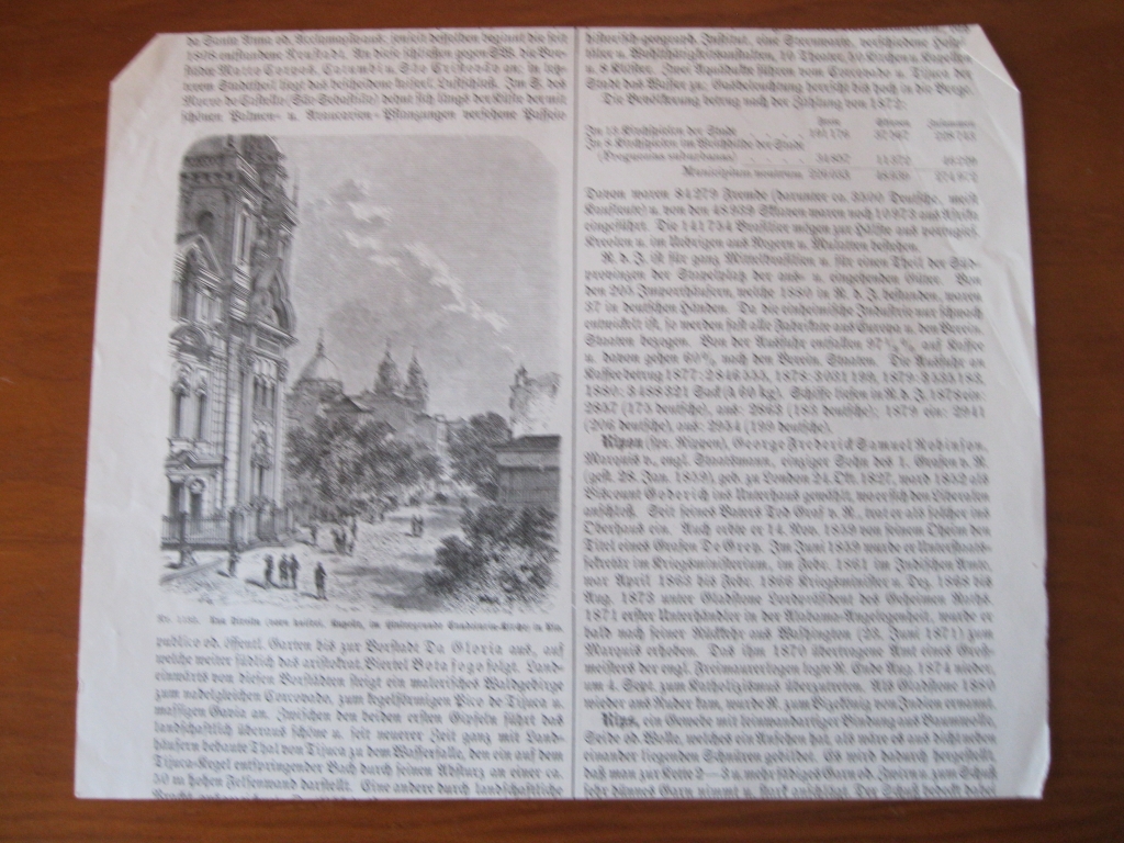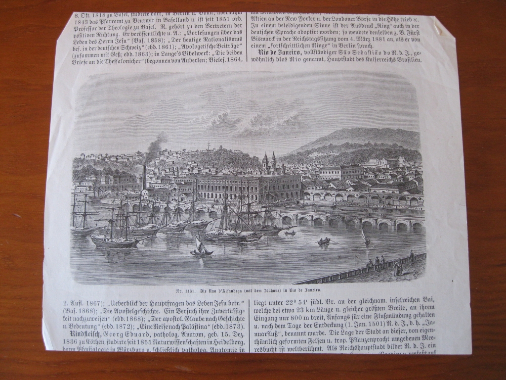 En el anverso podemos ver un hermoso grabado con una vista paisajística de la centrica calle da Alfándega (Aduana), situada en Rio de Janeiro (Brasil), entre texto escrito en alemán y en el reverso otro grabado con una vista de la calle Direita (Directa), también de esta ciudad.