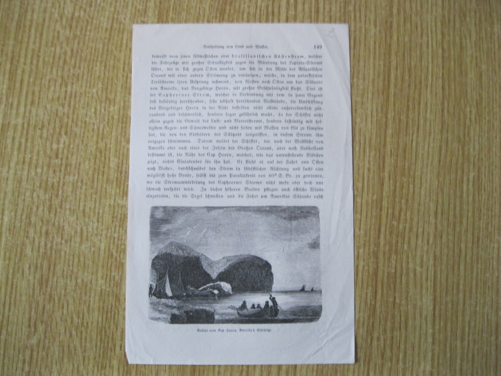 En el anverso podemos ver un texto escrito en alemán, junto con un hermoso y detallado grabado, en su parte inferior, en el que podemos ver un desembarco en una playa de América del Sur. En el reverso posee la continuación del texto.